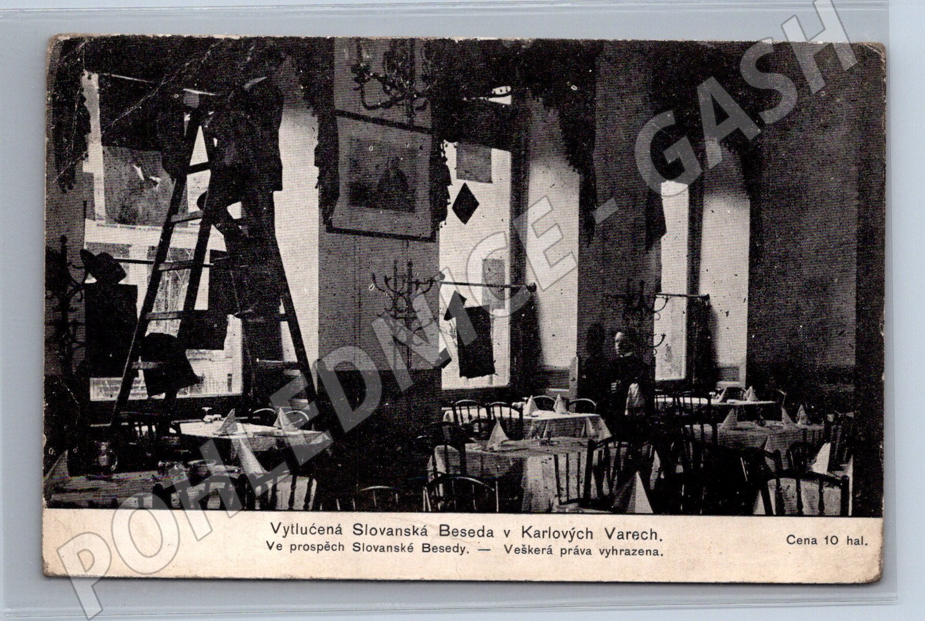 Originální stará pohlednice s motivem vyobrazení interiéru Slovanské Besedy v Karlových Varech, zřejmě po zásahu či poškození ( Vylučená Slovanská Beseda v Karlových Varech ). Snímek zachycuje dobové vybavení restaurace a atmosféru doby. Vydal O. J. Bukáč, Most. Pohlednice byla určena ve prospěch Slovanské Besedy. Stav viz foto – lehce opotřebovaná, rohy mírně ohnuté, odpovídá svému stáří. Formát dopisnice, rub čistý, nepopsaný.
