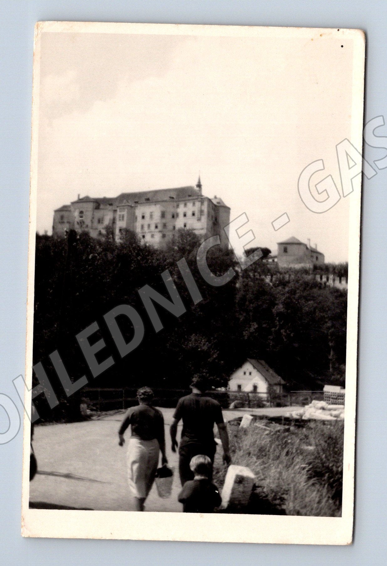 Originální černobílá pohlednice zachycující zámek Šternberk. Na přední straně je pohled na zámek z dálky, v popředí lze vidět osoby procházející po cestě. Jedná se o historickou pohlednici z období první poloviny 20. století, s typickými znaky tehdejší fotografie. Pohlednice nese známky stáří a drobné opotřebení na okrajích. Zadní strana je popsaná tužkou, bez známky a bez textu adresáta. Skvělý sběratelský kousek pro milovníky českých památek a historických objektů.