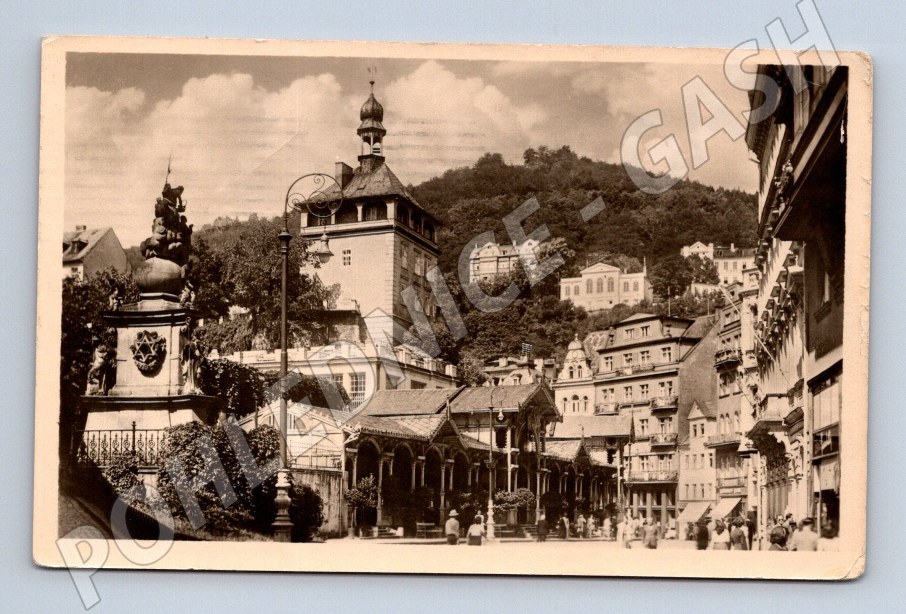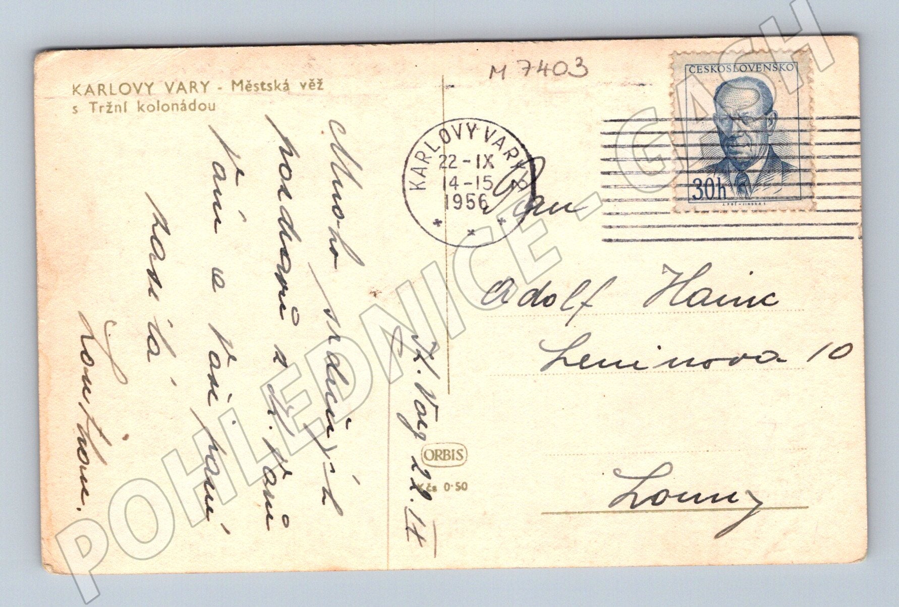 Originální černobílá pohlednice z Karlových Varů, zobrazující městskou věž s Tržní kolonádou. Na přední straně je zachycena část města s mnoha historickými budovami a sochou v popředí. Pohlednice je nadepsána a odeslána v roce 1956, opatřena poštovní známkou a razítkem. Na rubu je čitelný rukopisný vzkaz adresovaný na Louny. Pohlednice je v pěkném sběratelském stavu, mírně opotřebená, odpovídá svému stáří. Ideální k rozšíření sbírky historických pohlednic českých měst.