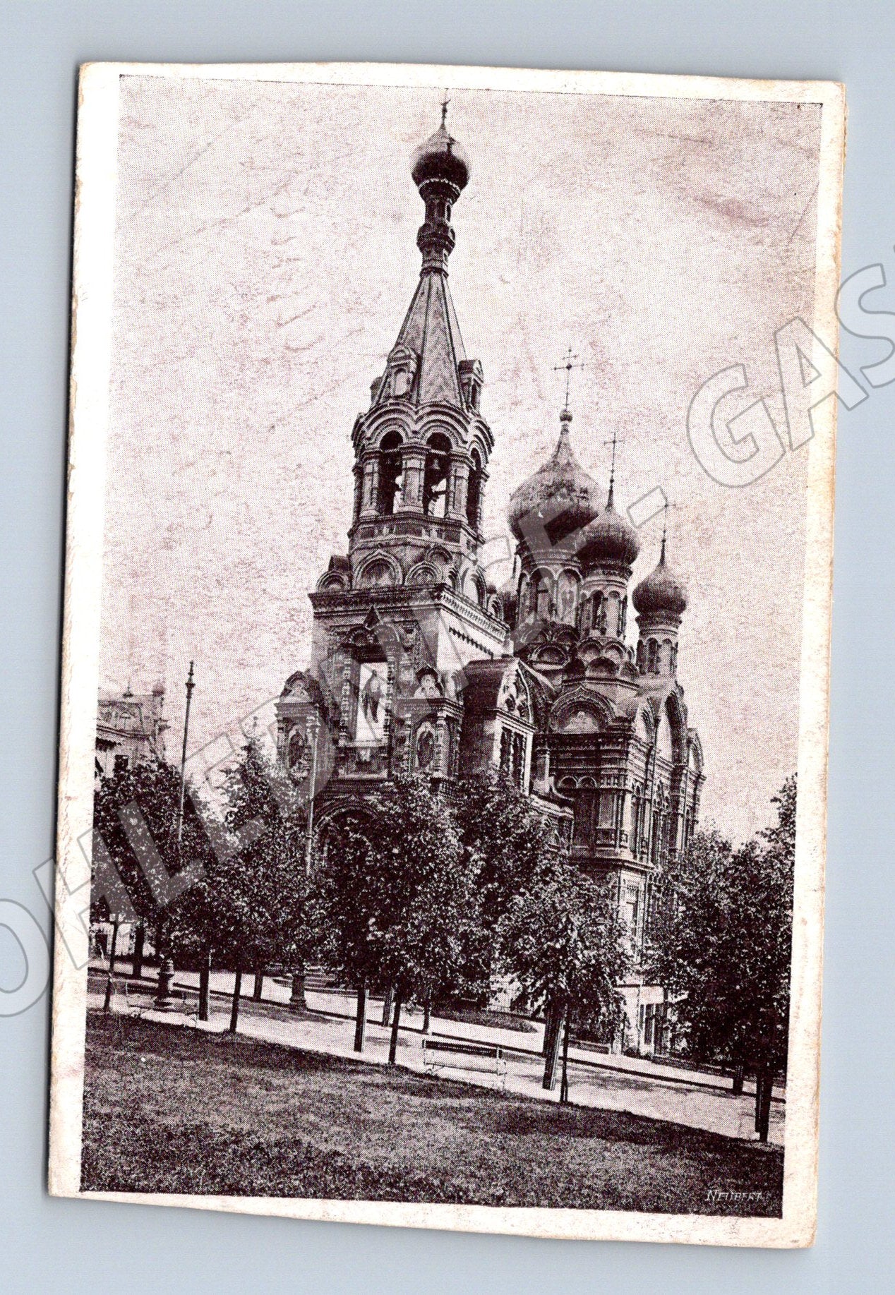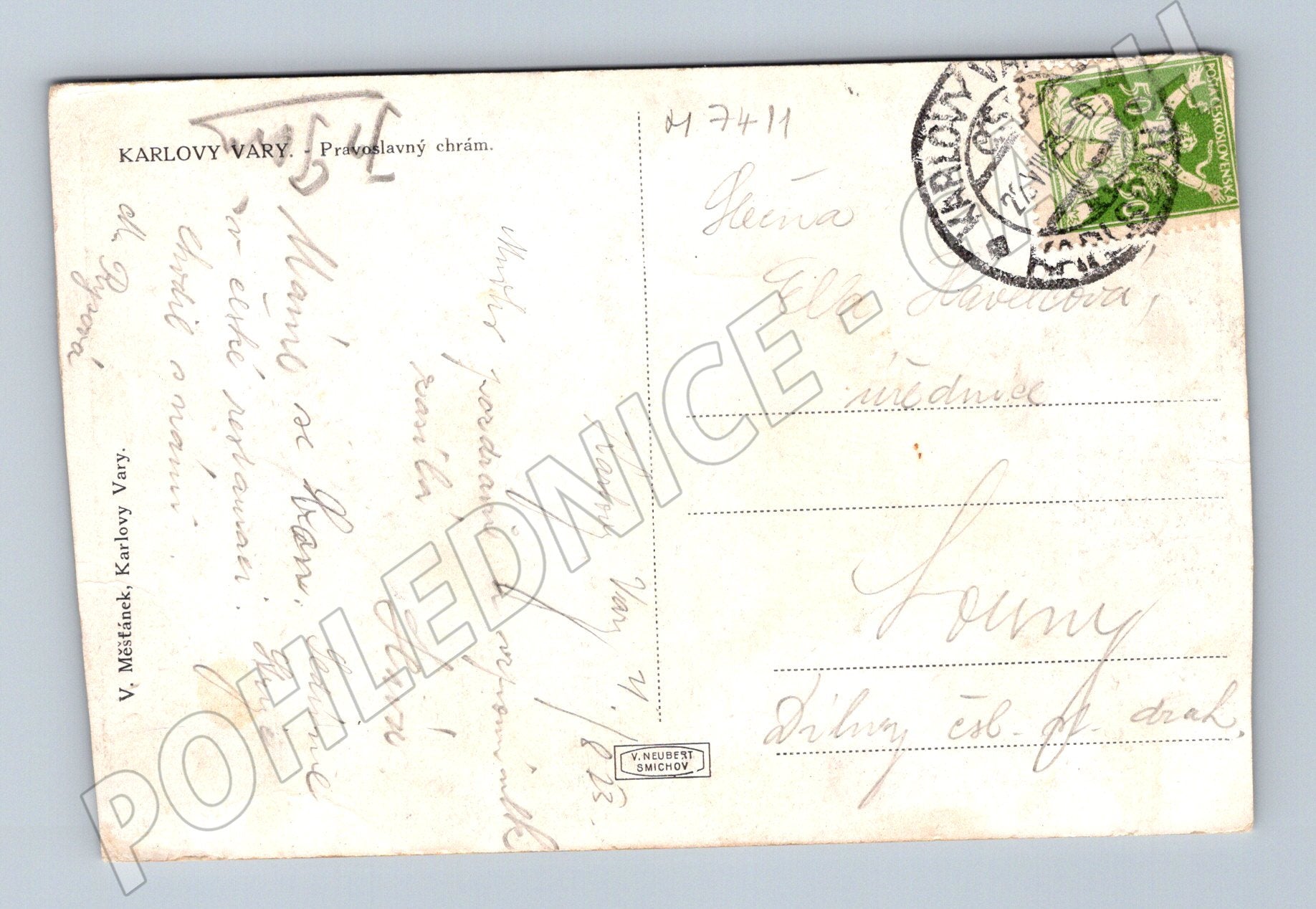 Starobylá pohlednice zobrazující pravoslavný chrám sv. apoštolů Petra a Pavla v Karlových Varech. Pohlednice pochází z období před rokem 1950, je v malém formátu a byla zaslána poštou. Na zadní straně je ručně psaný text, adresa a známka s razítkem Karlovy Vary. Pohlednice je černobílá, nese známky stárnutí a malého opotřebení na okrajích, což zvyšuje její sběratelskou hodnotu. Ideální přírůstek do sbírky historických pohlednic z Čech, zejména z období první poloviny 20. století.