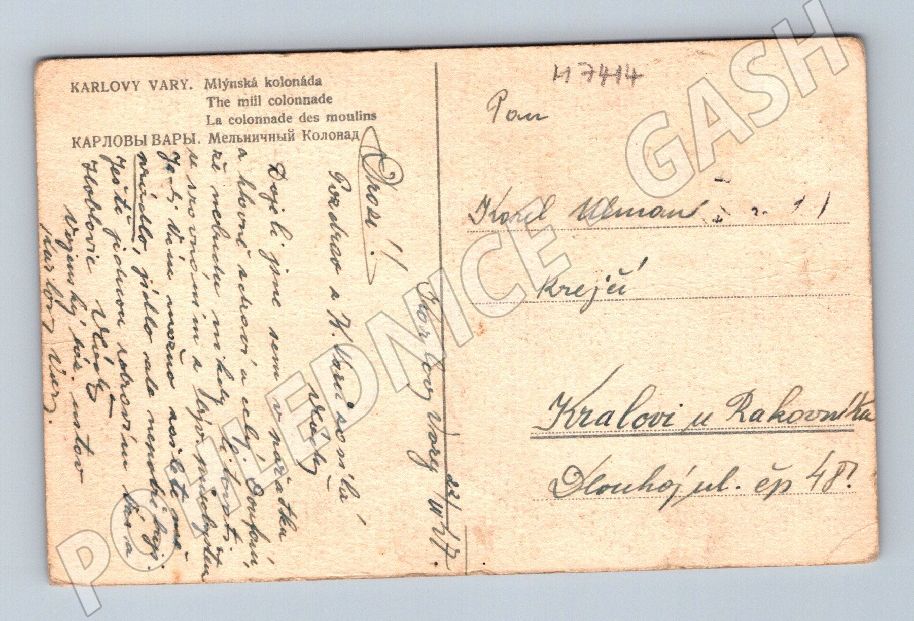 Historická pohlednice z Karlových Varů zobrazující slavnou Mlýnskou kolonádu a rušné korzo u řeky Teplé. Pohlednice pochází z první poloviny 20. století, což dokládá i malý formát a ručně psaný text na zadní straně. Kvalitní kolorizovaný tisk, pěkně zachovalý stav s drobnými známkami stáří. Významné místo českých lázní, ideální do sbírky nebo jako dárek.