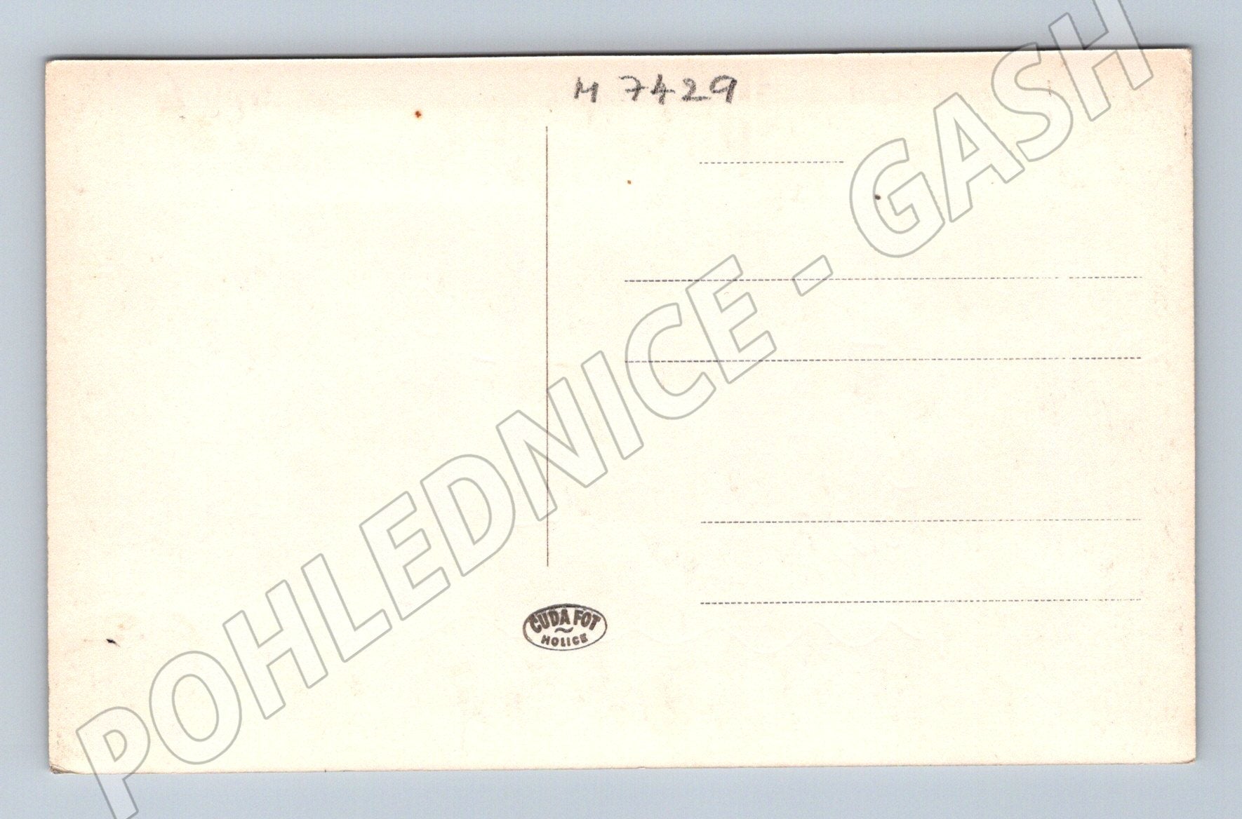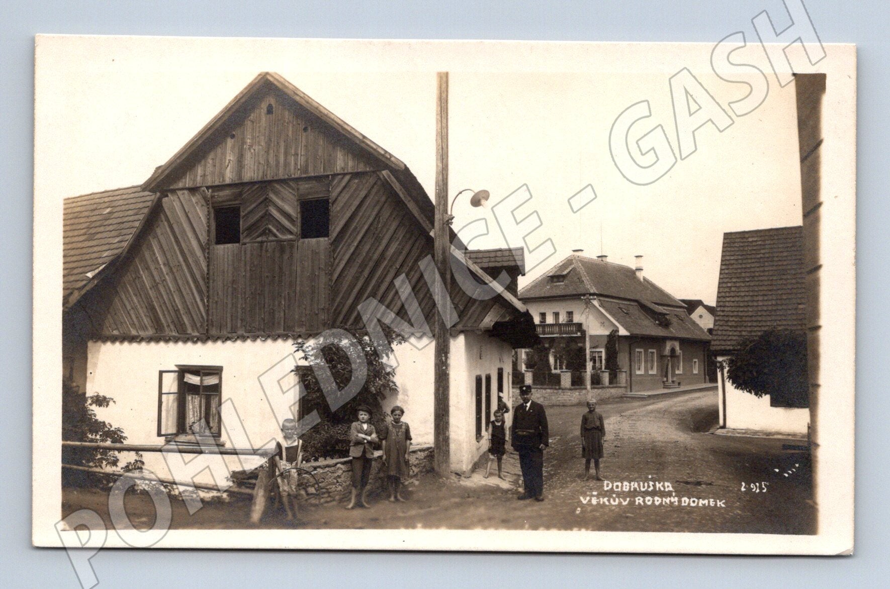 Originální černobílá pohlednice z obce Dobruška zachycující rodný domek významné osobnosti (Věkův rodný domek). Pohlednice pochází z období do roku 1950, jedná se o malý formát. Na přední straně je kromě domku také několik postav v dobovém oblečení. Zadní strana je čistá, bez popisu a známky, označená logem studia Čuda Fot z Holic. Pohlednice je ve velmi pěkném stavu, vhodná ke sběratelským účelům i jako dekorace.
