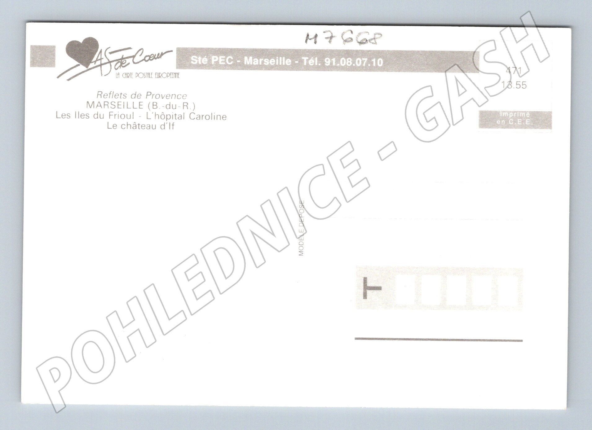 Original postcard with an aerial view of the city of Marseille and the surrounding islands in France. On the front side, a panoramic view of the sea, the port, the Frioul islands and the famous Château d If, which became famous in particular in the novel The Count of Monte Cristo, is clearly visible. On the back of the postcard, the publisher and a brief description of the place in French are listed. The postcard is in good condition, unposted, suitable for a collection or as a souvenir from Provence.