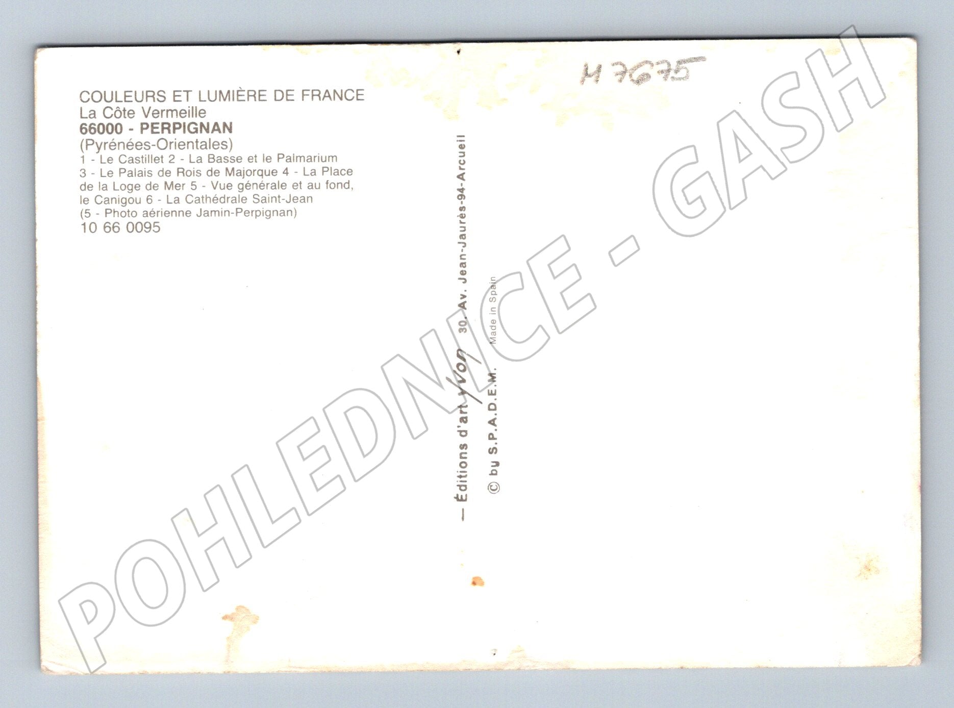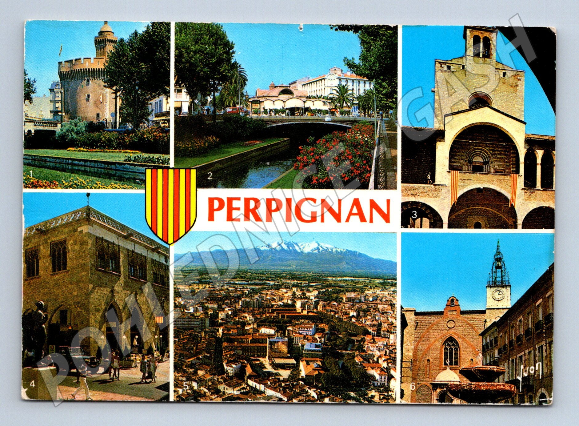 Original postcard from Perpignan, France (Pyrénées-Orientales department), depicting several important monuments and scenery of the city including Le Castillet, Saint-Jean Cathedral, Place de la Loge, Palace of the Kings of Mallorca, panorama with Mount Canigou and aerial photograph of Jamin-Perpignan. Colour postcard, published by Couleurs et Lumière de France (Éditions d'art Yvon), on the back side a more detailed description of the individual motifs. See photo for condition. Suitable for postcard collectors or those interested in French cities and monuments.
