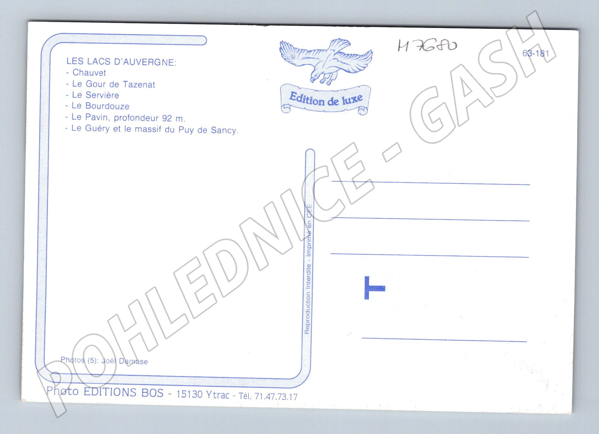 I am offering an original postcard depicting lakes in the craters of ancient volcanoes in the Auvergne region of France (Lacs de cratères des anciens volcans d Auvergne). On the front of the postcard are aerial photos of important lakes in this area, such as Lac Chauvet, Gour de Tazenat, Lac Servière, Lac Bourdouze, Lac Pavin and Lac Guéry, which lies in the Puy de Sancy massif. The postcard is in nice collector's condition, without inscription, unused. Published by Editions BOS. A great tip for collectors of French postcards, lovers of nature and geology or as a nice souvenir from France.