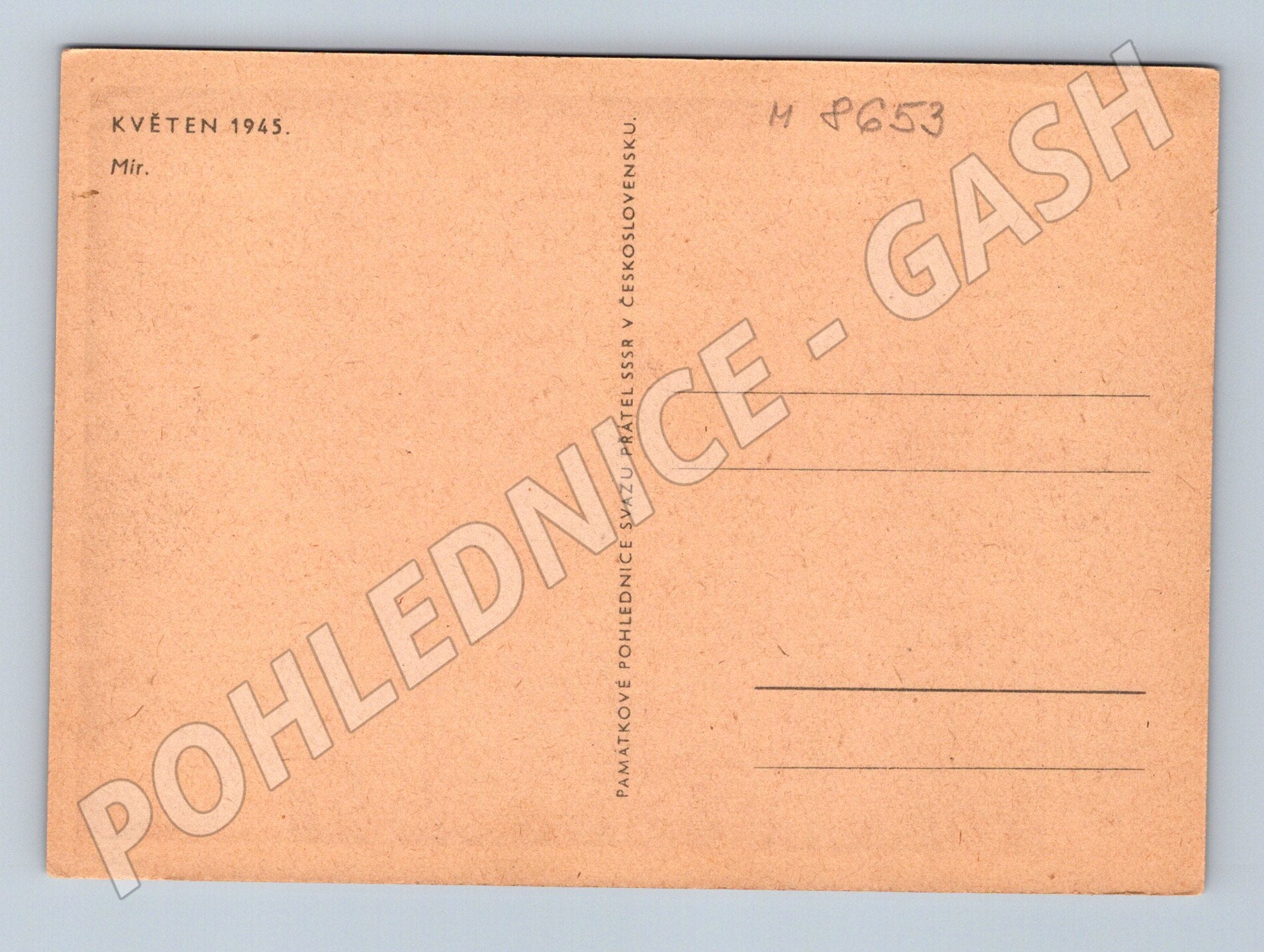 Historical postcard titled May 1945. Peace. issued by the Union of Friends of the USSR in Czechoslovakia. On the front of the postcard is a black and white photograph depicting the May events of 1945 in the territory of the then Czechoslovakia, which symbolize the end of World War II and the arrival of peace. The back has brief descriptions and standard layout for sending. This is an authentic historical print, suitable for collectors and those interested in commemorative postcards with a war theme. The postcard is in very good condition, with no signs of use.