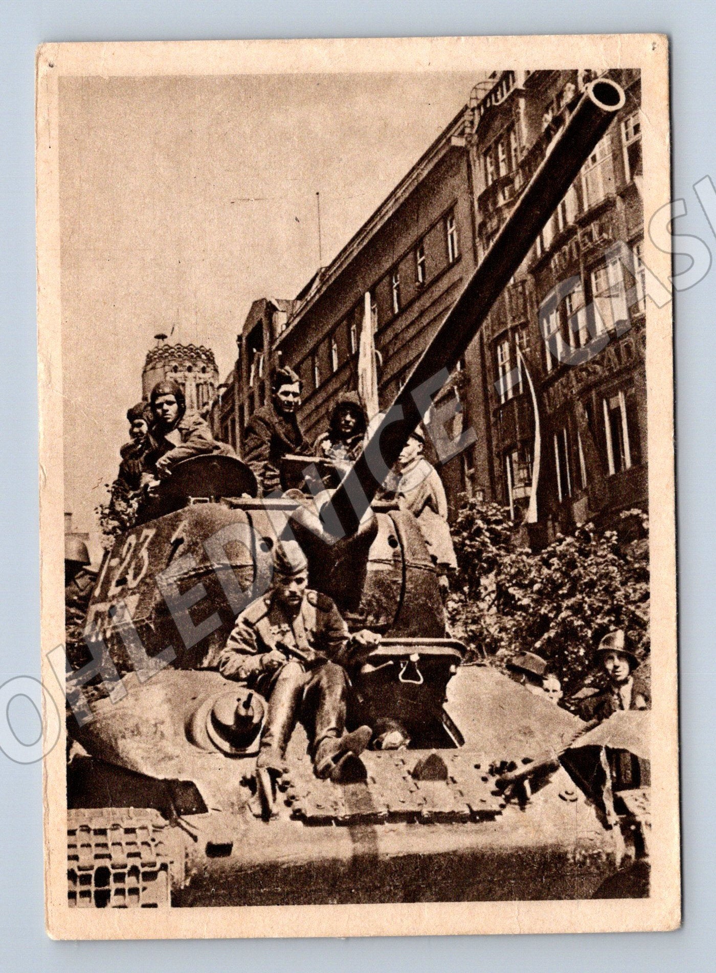 Original historical postcard from the Second World War, depicting the arrival of tanks in the city, probably as part of the liberation operations. The postcard shows a tank passing through a city street, with residents gathering around to welcome the soldiers. On the back is the inscription Finally arrived! . The postcard shows signs of age (see condition in the photos), is unmarked and undescribed, ready for further collector's use. Suitable for a collection of historical postcards with a military theme or for those interested in transport technology and the history of transport.