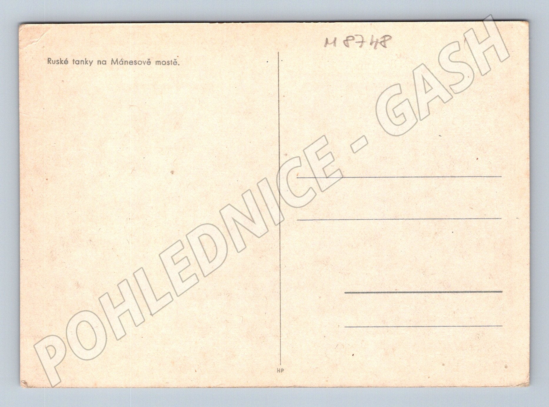 Historical black and white postcard depicting the passage of Russian tanks across the Mánes Bridge in Prague. The photograph shows period traffic, military vehicles and pedestrian observers. In the background is the panorama of Prague Castle. On the back of the postcard is a pre-printed description Russian tanks on the Mánes Bridge. The postcard is unposted, in good collector's condition with minor wear on the corners. This is an authentic document of its time, suitable for collectors of historical postcards or those interested in the period of World War II or the post-war history of Prague.