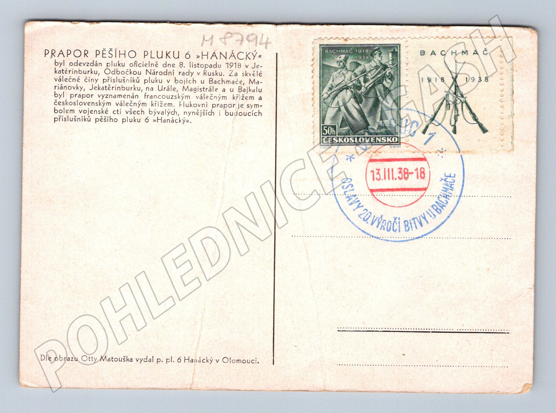 Postcard - battalion of the 6th Hanácký Infantry Regiment, Bachmač 1918-1938, postmark, stamp