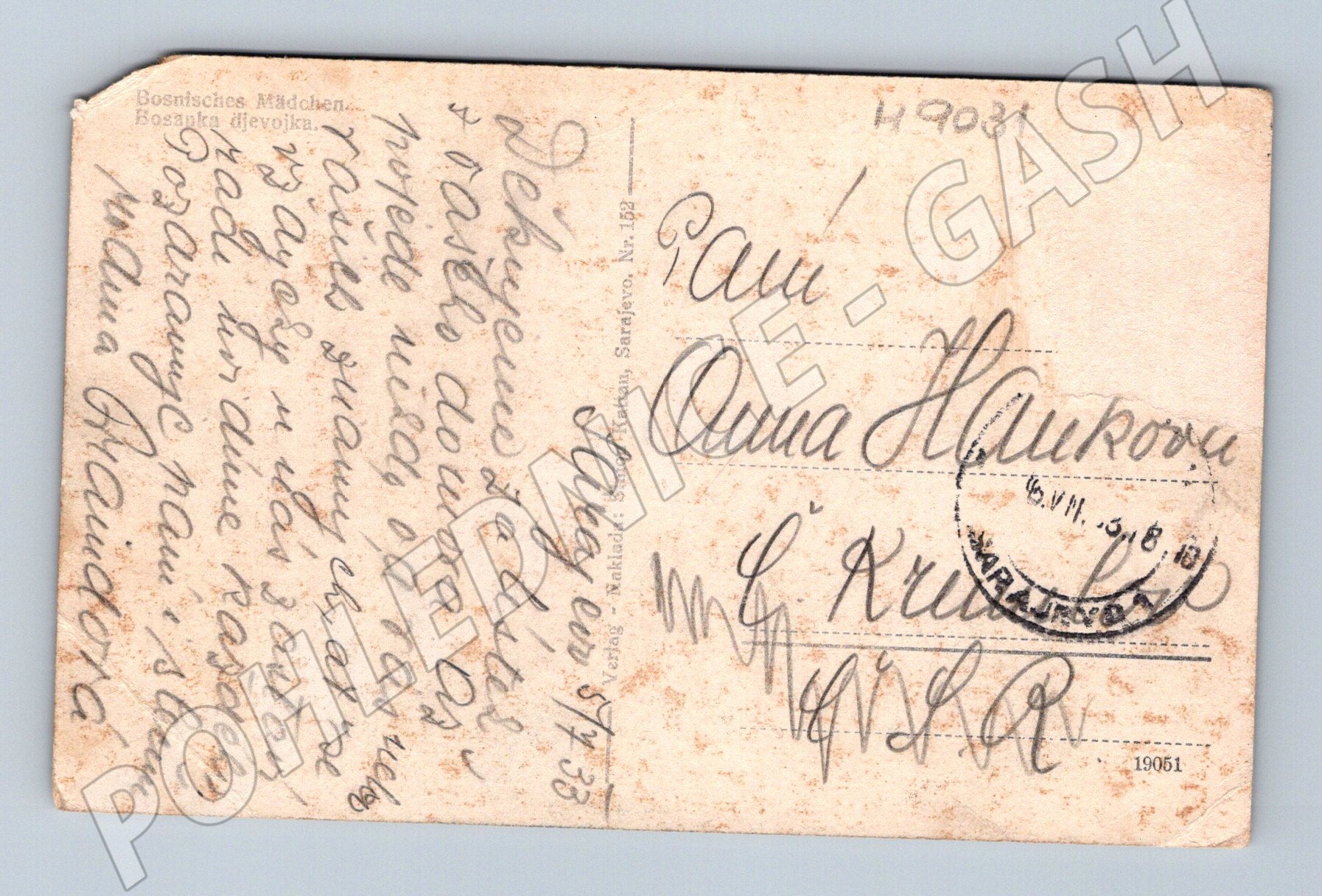 Starobylá pohlednice s etnografickým motivem – bosenská dívka v tradičním kroji. Pohlednice je popsána a prošla poštou v roce 1913, viz razítko. Na přední straně je barevně laděná ilustrace mladé ženy v krojovém oděvu, typickém pro bosenský region. Na zadní straně ručně psaný text adresovaný paní Anně Hanikové. Stav pohlednice odpovídá stáří – ohlé a roztřepené rohy, patrné stopy používání a lehké poškození, přesto pěkně zachovalý obraz i text. Vhodné pro sběratele historických nebo etnografických pohlednic.