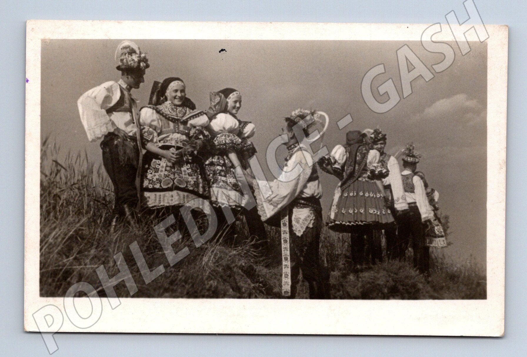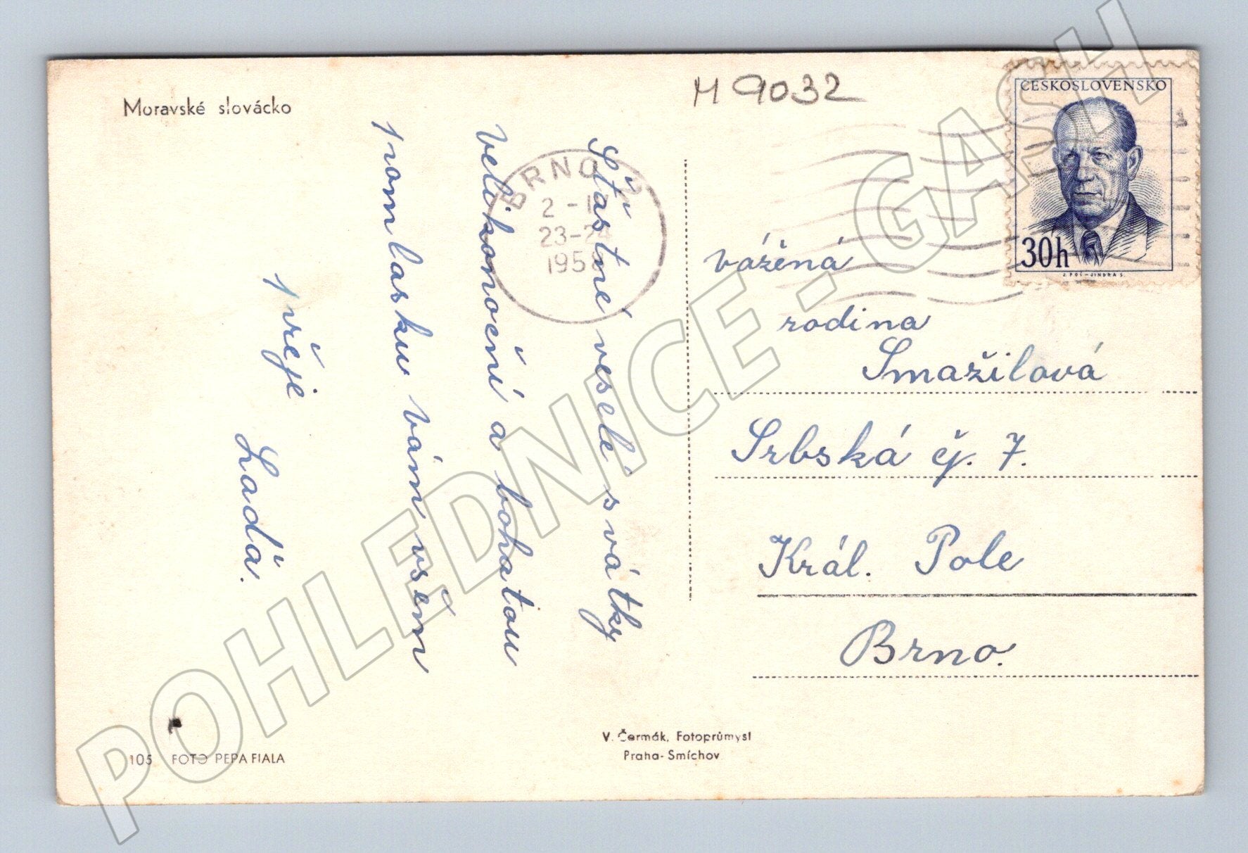 Originální stará pohlednice s názvem Moravské Slovácko , focená Pepou Fialou. Pohlednice zachycuje skupinu mužů a žen v tradičních moravských krojích, typických pro oblast Slovácka. Na zadní straně je ručně psaný pozdrav a čitelně vyplněná adresa příjemce. Pohlednice byla odeslána v roce 1951 a je opatřena dobovou československou známkou s portrétem prezidenta. Skvělý sběratelský kousek pro milovníky folkloru a historie českých regionů. Stav dle fotografií, vhodné do sbírky.