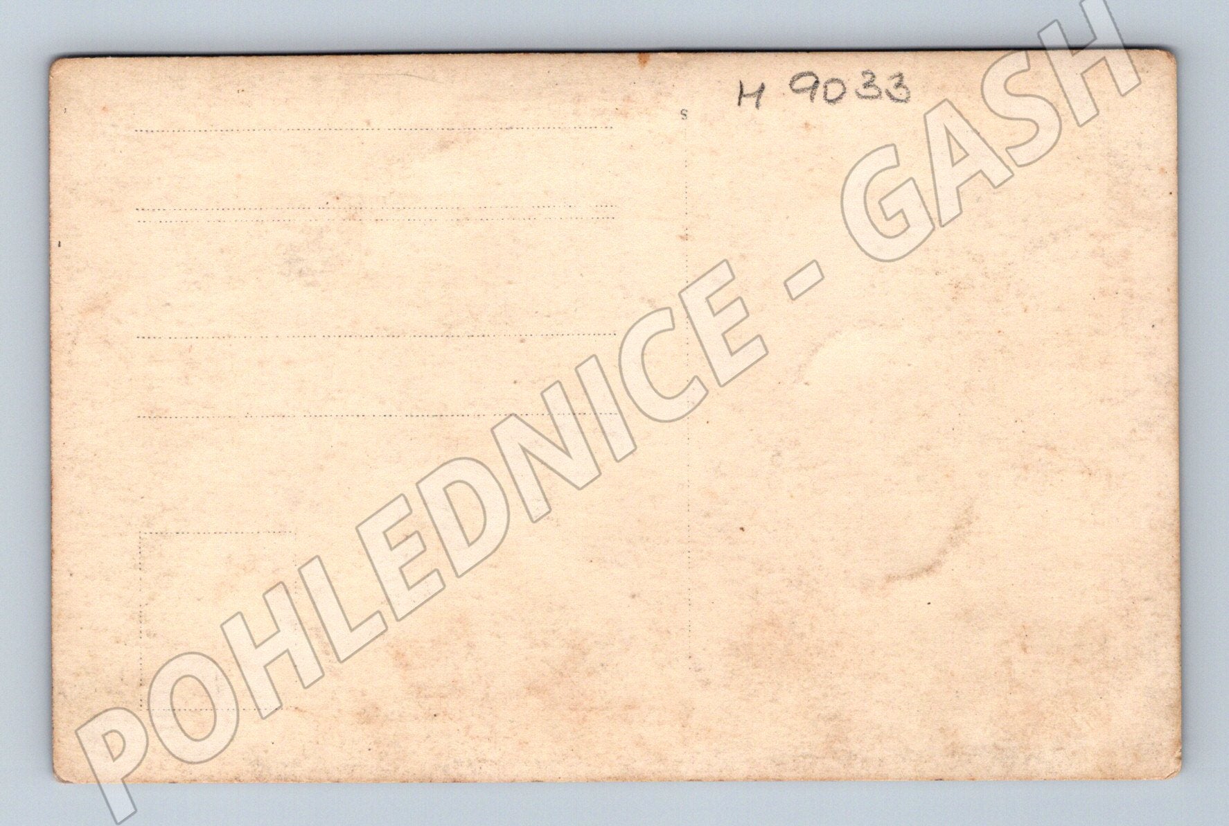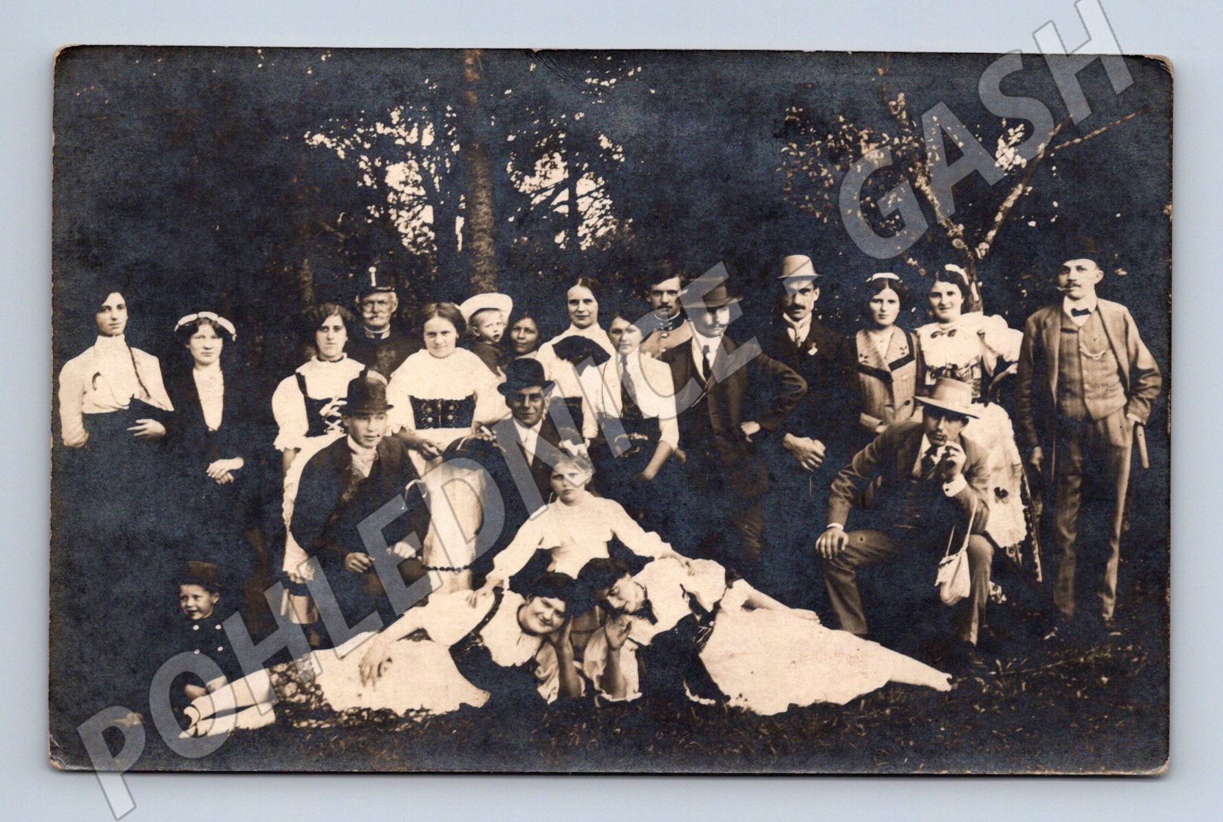 Starobylá černobílá pohlednice zachycující skupinu lidí v dobovém oblečení, pravděpodobně z počátku 20. století. Někteří z účastníků mají na sobě tradiční kroje a uniformy, jiní pánské a dámské oděvy typické pro tu dobu. Fotografie byla pořízena v exteriéru pod stromy a vyzařuje silnou atmosféru tehdejší společnosti. Rub pohlednice je nevyplněný, pouze s číslem H 9033. Jedná se o zajímavý etnografický a historický materiál vhodný do sbírky pohlednic se zaměřením na etnografii a společenský život první poloviny 20. století.