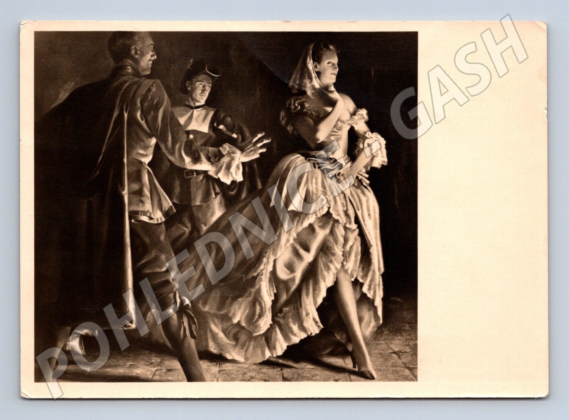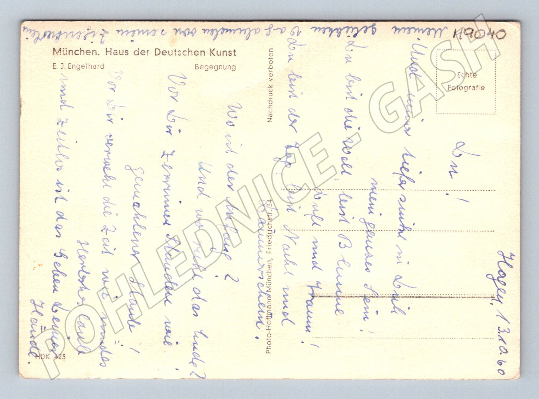 Originální stará pohlednice s uměleckou fotografií ze série München. Haus der Deutschen Kunst od fotografa E. J. Engelhard, označená názvem Begegnung (Setkání). Pohlednice zachycuje stylizovanou scénu s trojicí postav v dobových kostýmech, zřejmě z taneční či společenské události 18. století. Na zadní straně je ručně psaný německý text datovaný 1960, najdeme zde také označení Echte Fotografie a sériové číslo HDK 423. Pohlednice je určena sběratelům uměleckých a tematických pohlednic spojených s malířstvím, uměním a historií. Skvělý stav, vhodné do sbírky.
