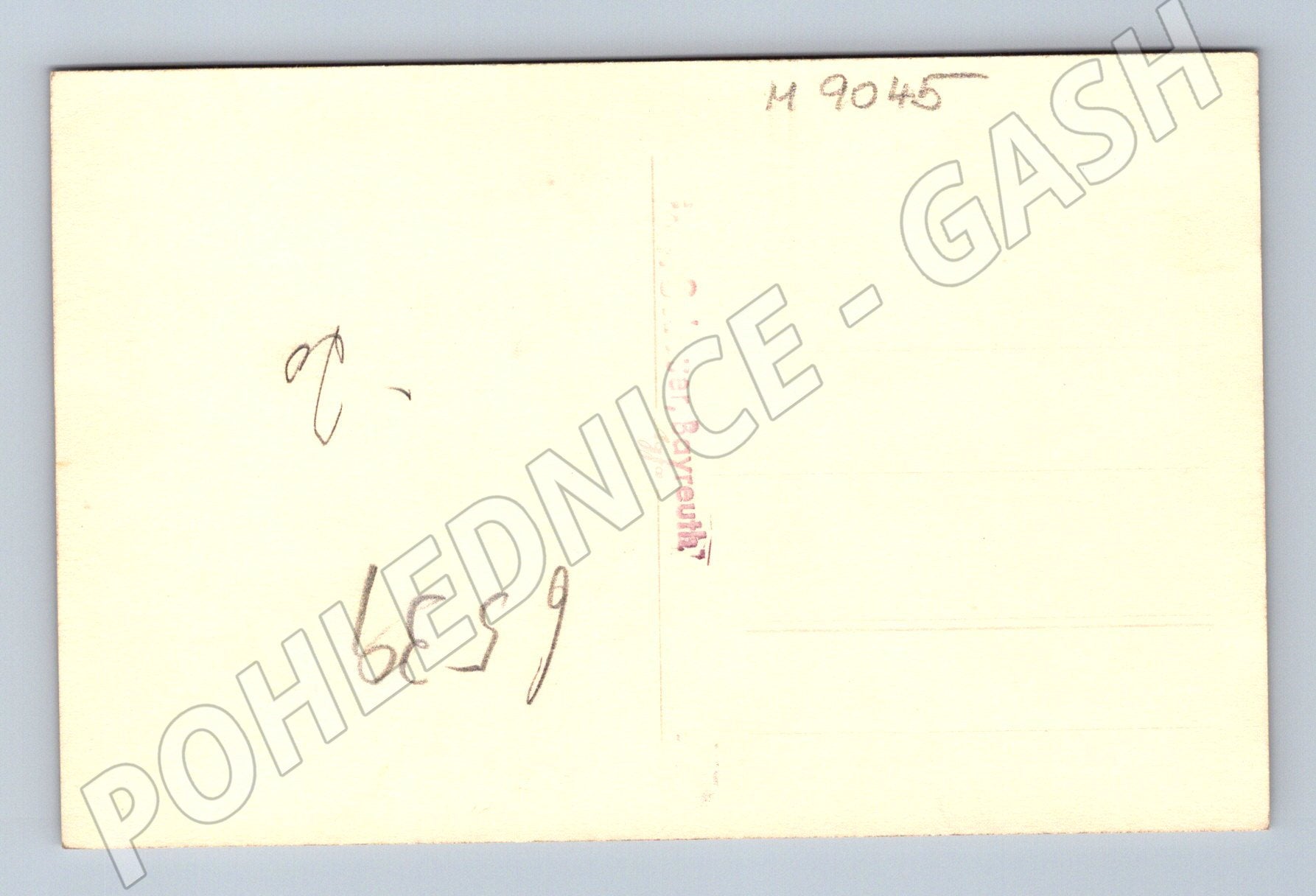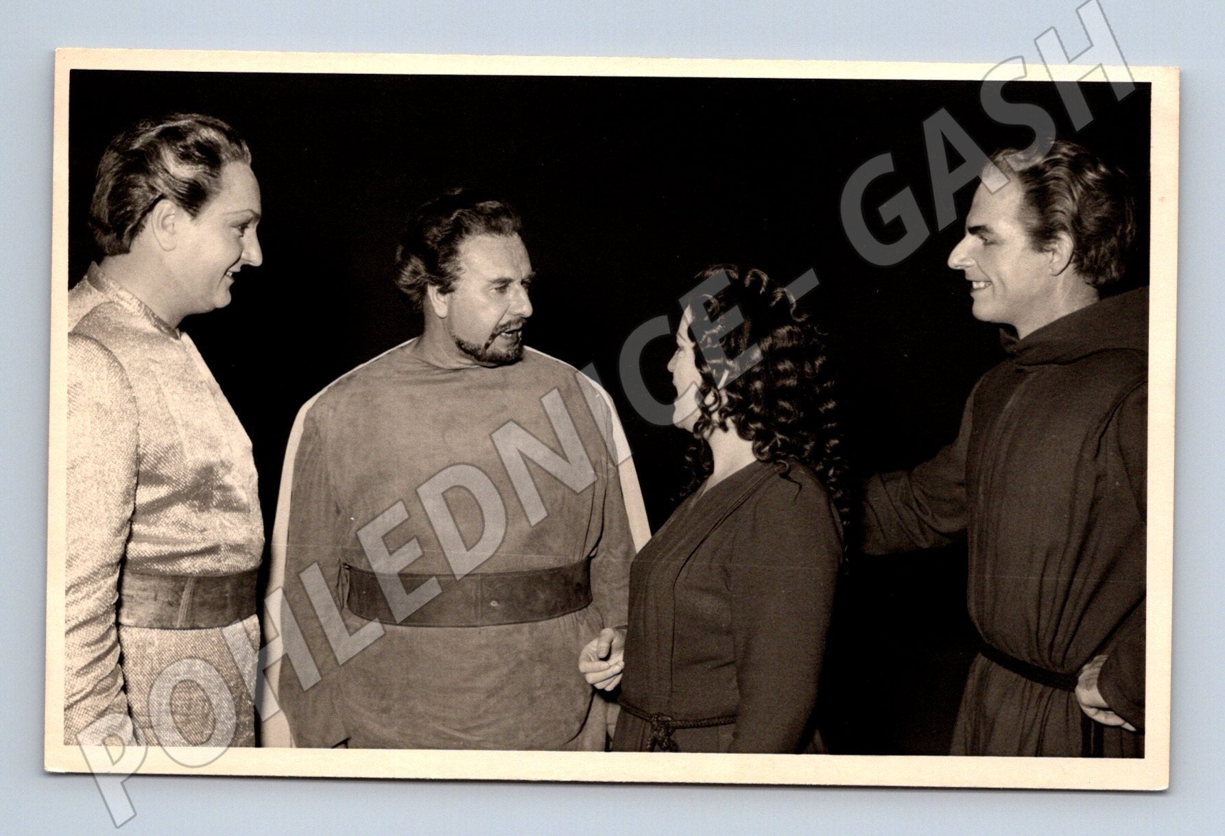 Originální černobílá pohlednice zobrazující skupinu čtyř osob ve scénickém či divadelním kostýmu. Pohlednice je zřejmě z kulturního nebo hereckého prostředí, což dokládá nevšední oblečení a stylizace postav. Na zadní straně je ručně psané číslo a razítko s textem. Pohlednice má lehké známky stáří, rohy jsou mírně ošoupané, jinak je ve velmi dobrém stavu. Nejedná se o běžnou produkci, vhodné pro sběratele pohlednic s kulturní nebo hereckou tématikou úplně nebo jako doplněk do sbírky historických pohlednic.