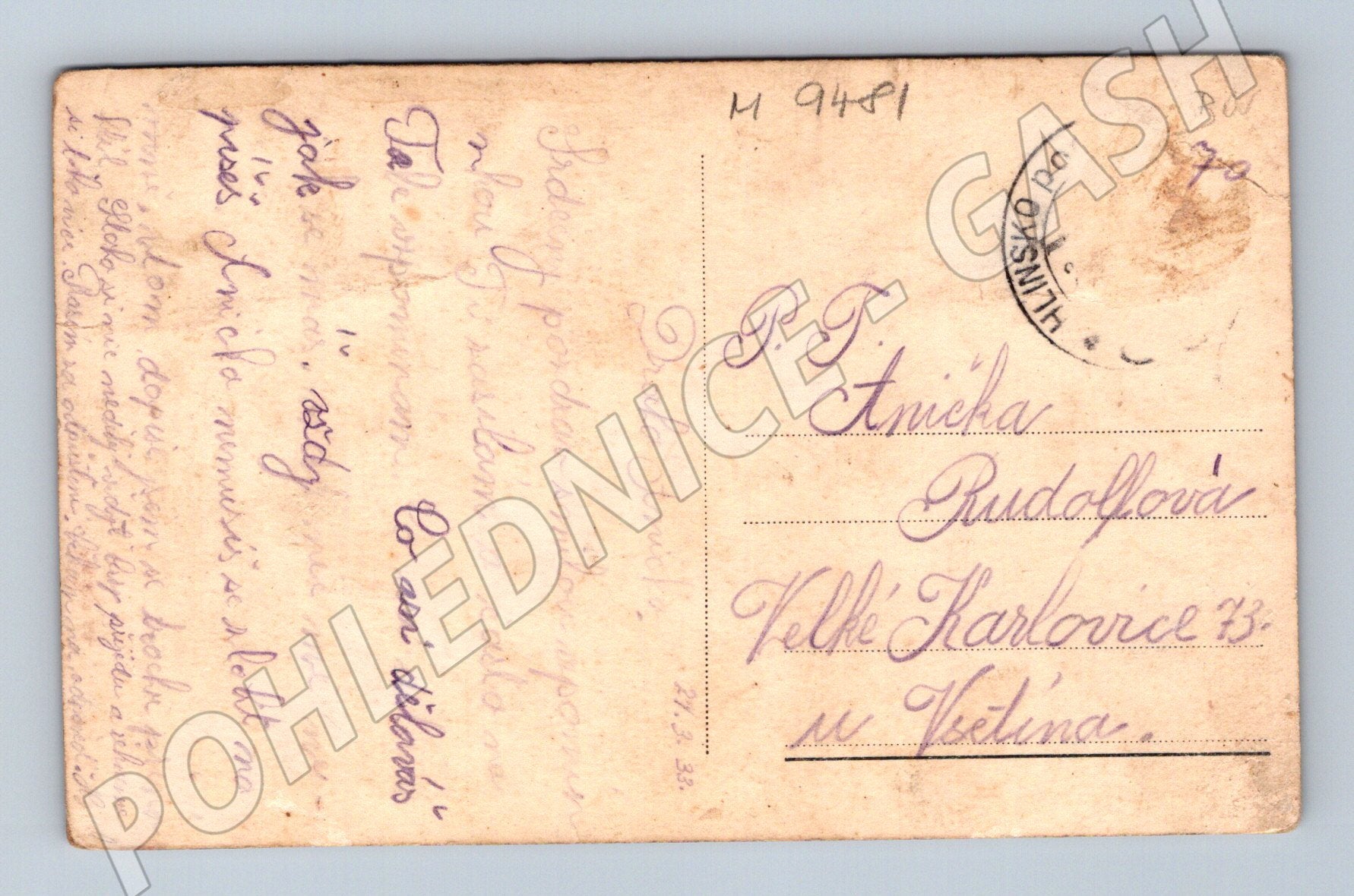 Original old small-format postcard from the period before 1950. The postcard depicts a romantic scene of a young couple under a tree. It is a black-and-white photograph with beautiful details and a period atmosphere. On the back there is a handwritten text, signs of use and a postmark. It is addressed to Miss Anička Rudolfová in Velké Karlovice. Suitable for collectors of historical postcards, lovers of old times or as a stylish decorative accessory. The condition corresponds to its age - there is some wear, bending and light soiling. Nevertheless, it is in preserved collector's condition.