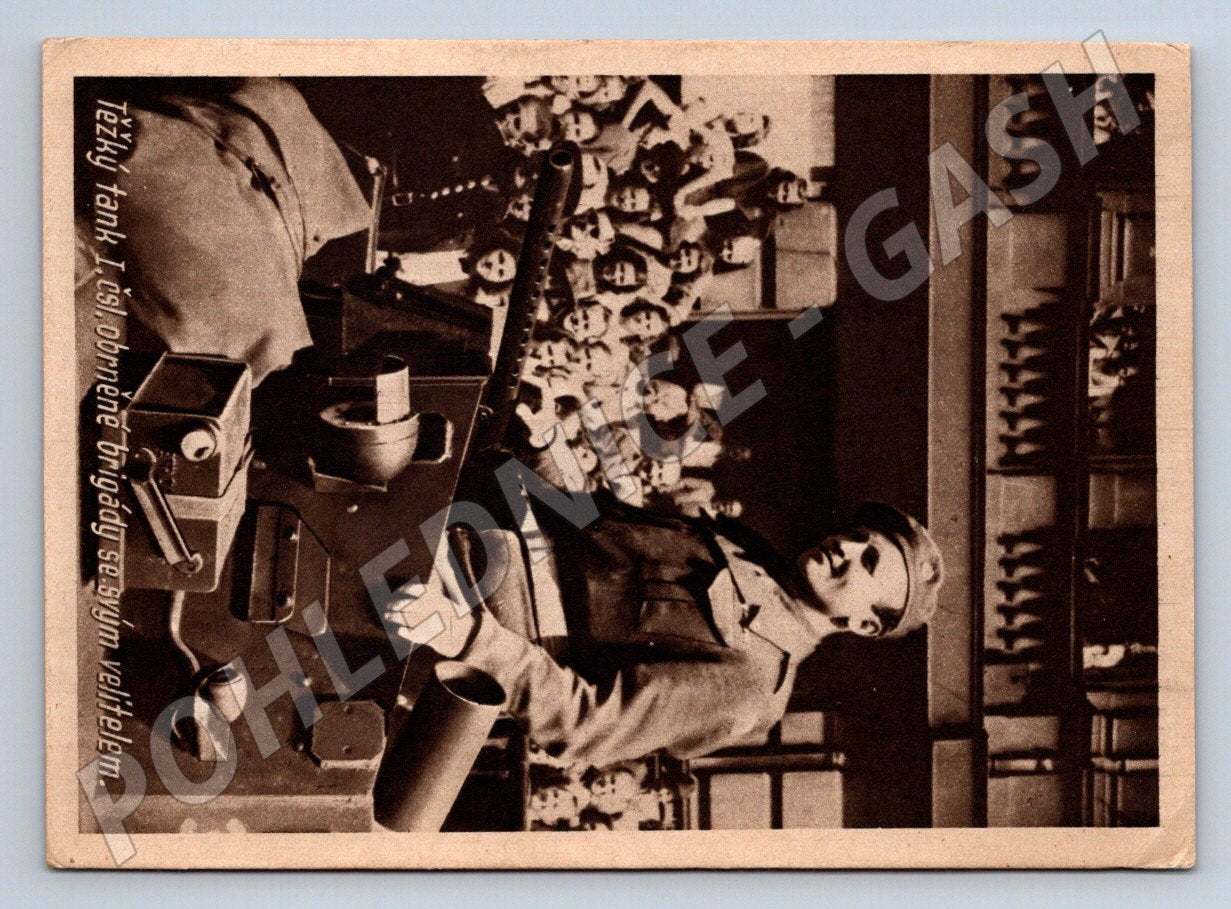 This historical postcard depicts a cavalry tank of the Czechoslovak Armored Brigade, an interesting piece of military equipment from the period before World War II. The postcard is printed in black and white and captures a close-up view of the armored vehicle in the front, with a soldier in uniform clearly visible. The photograph captures the military atmosphere and technical design of the tank, which will certainly appeal to collectors of military postcards or those interested in military history.