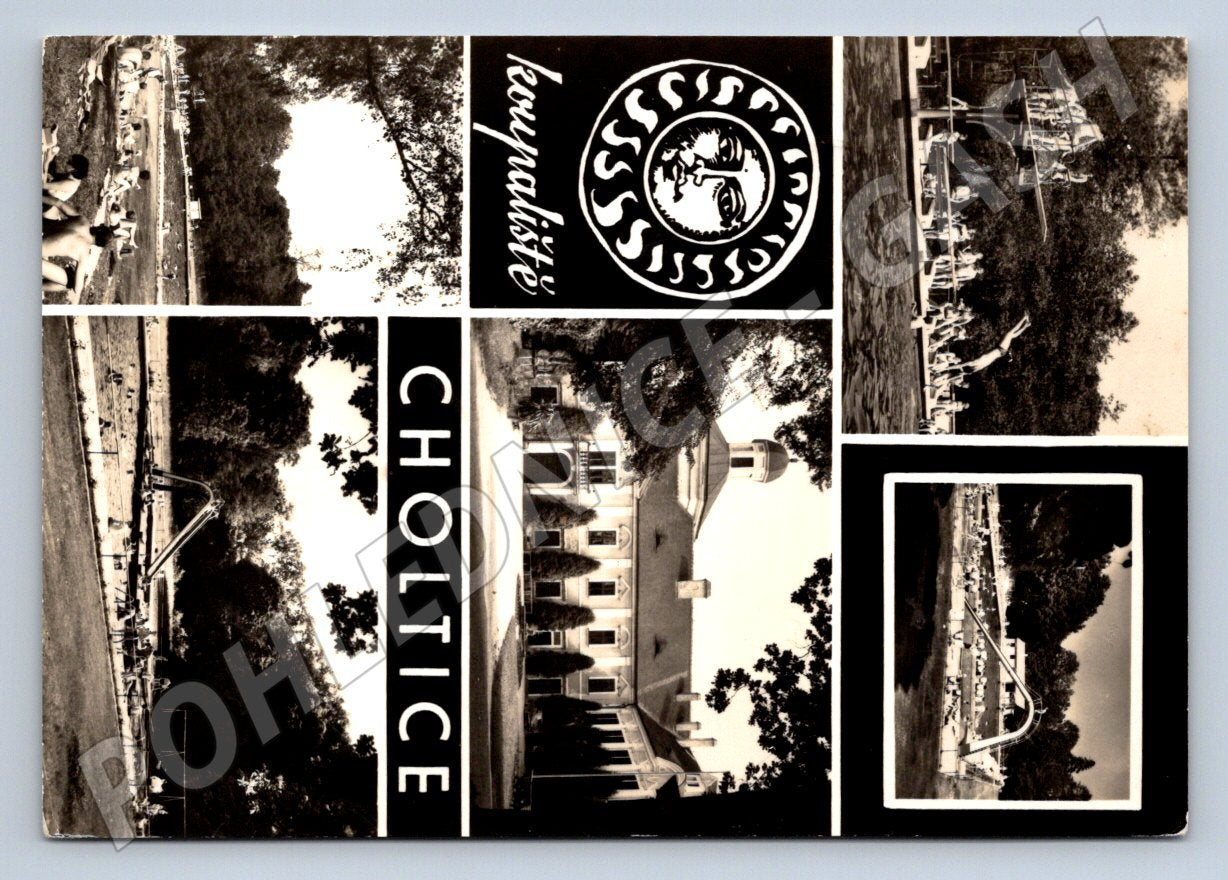 I am offering an old postcard titled Choltice, depicting the historic castle and its surroundings, including the swimming pool and the ČSTV gymnasium. The postcard is black and white, with several photographs depicting the castle, natural scenery and parts of the swimming pool equipment. The publisher is Nakladatelství Dürschmidt Praha. The postmark corresponds to the period around 1979. The postcard is in nice condition, suitable for collectors of historical souvenirs and lovers of Czech history and architecture.