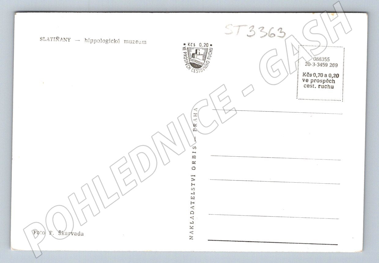 Black and white postcard depicting a historic castle with a distinctive horse statue on a pedestal in the foreground. The postcard is in good condition, with no visible damage. On the back there is a place for an address and a stamp, with the printed name of the place Slatiňany and the author of the photograph F. Škvrud. This postcard is ideal for collectors focusing on Czech castles and chateaux, historical photographs or postcards with a thematic focus on architecture and sculpture.