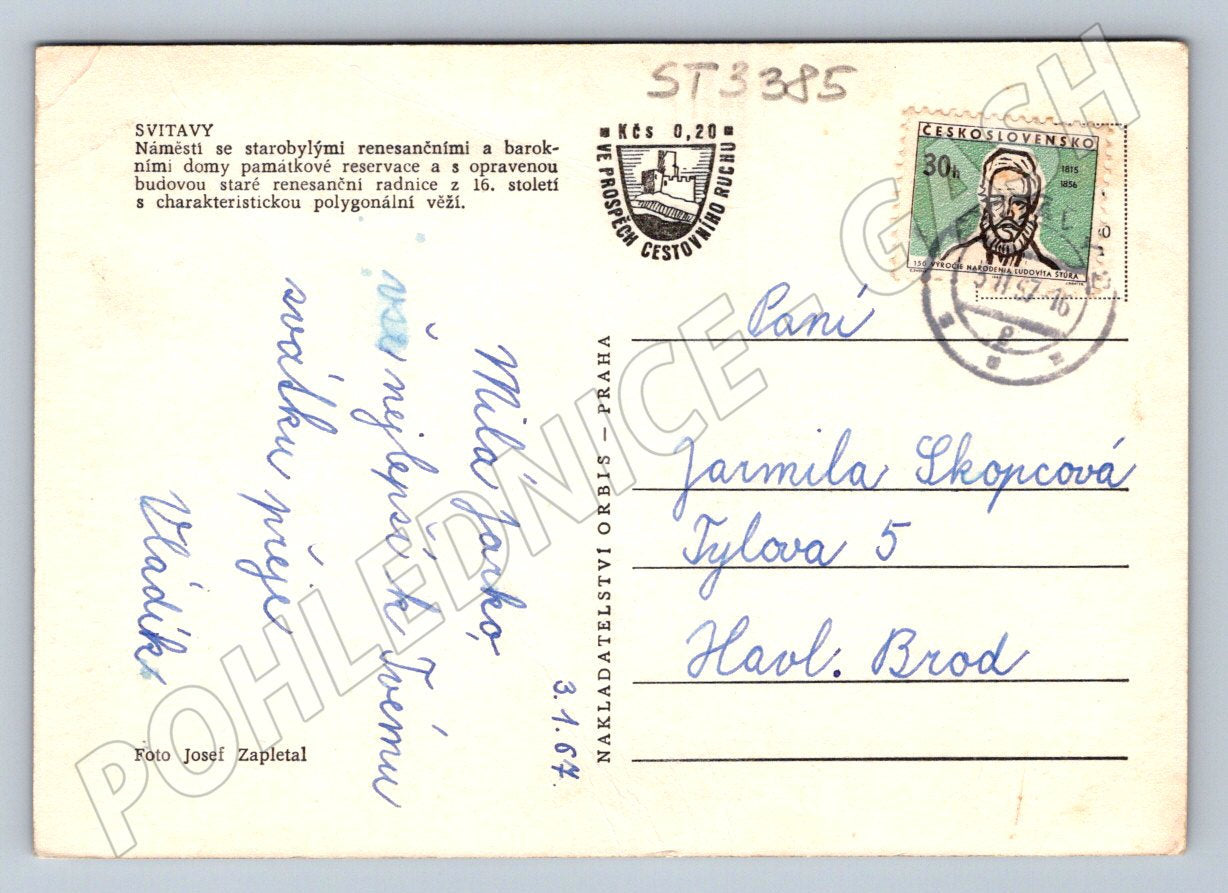 This black and white postcard depicts the historic square of the town of Svitavy with ancient Renaissance and Baroque houses, listed and repaired. The characteristic polygonal tower, which is a significant landmark of the town, is also visible in the picture. On the back of the postcard is a written greeting from 1964 with a stamp and stamp of Czechoslovakia, which proves its period character and collector's value. The photo was taken by Josef Zapletal. The postcard is ideal for collectors of historical motifs of cities and architecture, as well as for lovers of Czech monuments.