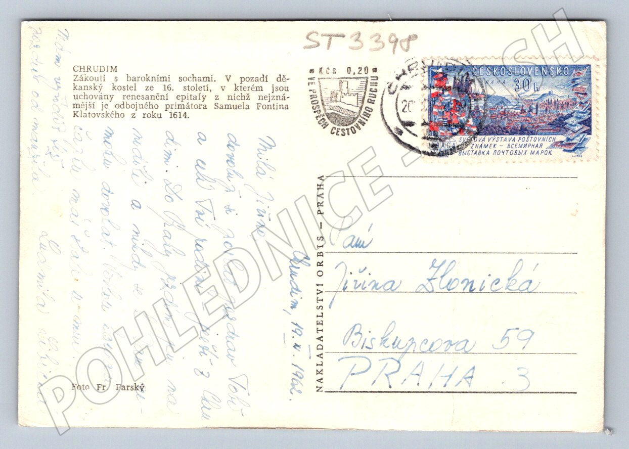 This postcard captures a historical view of a significant architectural monument - a church with Gothic elements and towers, surrounded by smaller buildings and a park with a fountain and a statue in the foreground. The postcard is black and white, with a period photographic style that emphasizes the historical atmosphere of the place. On the reverse side, the postcard is marked with a stamp of the Slovak State and a postmark, along with a handwritten dedication addressed to Prague. The postcard is ideal for collectors of historical and architectural motifs, especially lovers of Gothic architecture and Czechoslovak history. The postcard is in good condition, suitable for proper display or other collector's purposes.