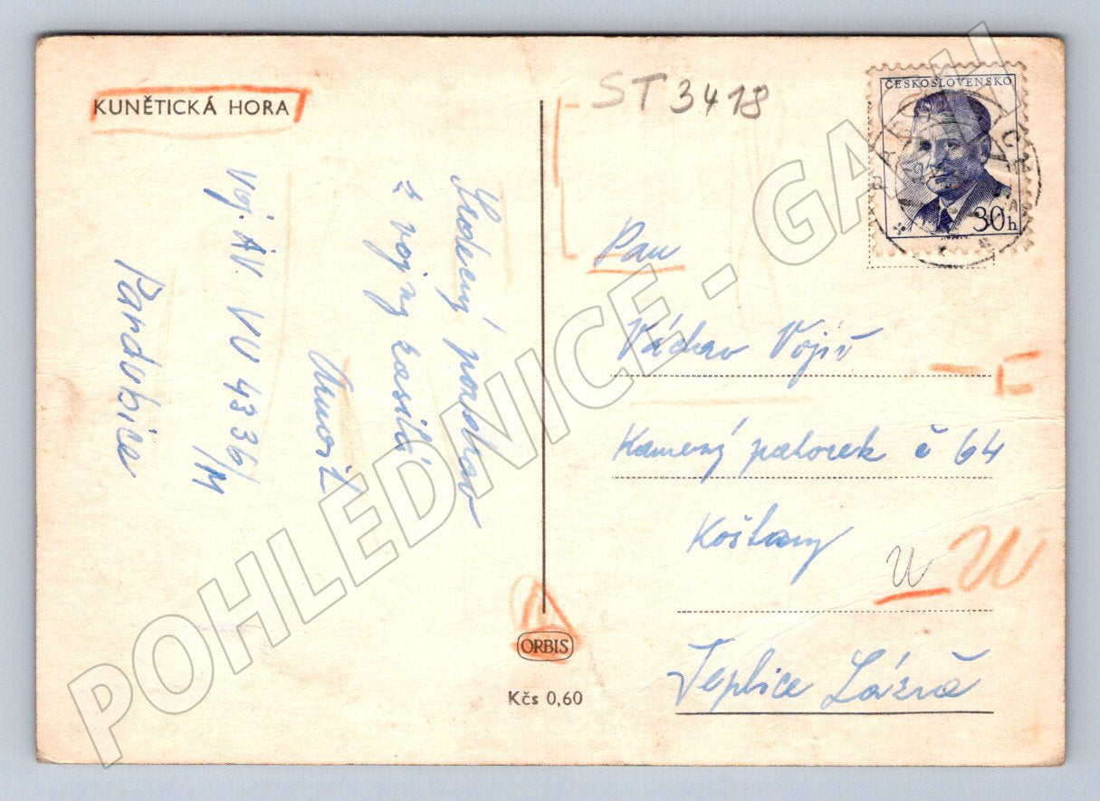 This old postcard depicts the historic Kunětická Hora Castle in black and white. The postcard is stamped and addressed, which indicates its actual use in the past. Kunětická Hora is known for its picturesque location and Gothic architecture, which makes this postcard an interesting collector's item for history and old postcard lovers. The postcard dimensions are standard, the condition is visibly preserved with minor signs of age and use. An ideal addition to any collection of historical postcards focused on castles and chateaux in the Czech Republic.