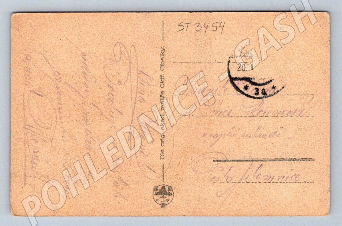 An old illustrated postcard with a drawing of a woman sitting by a window. The motif is in an artistic style with handwritten text on the left side. The postcard bears signs of postal use, including a clearly visible postmark dated 20. 1. 1938 and the address on the reverse. Overall, the condition of the postcard is very good, the colors are still distinct, the text is legible. A unique collector's item for lovers of historical postcards with a painting motif and old correspondence.