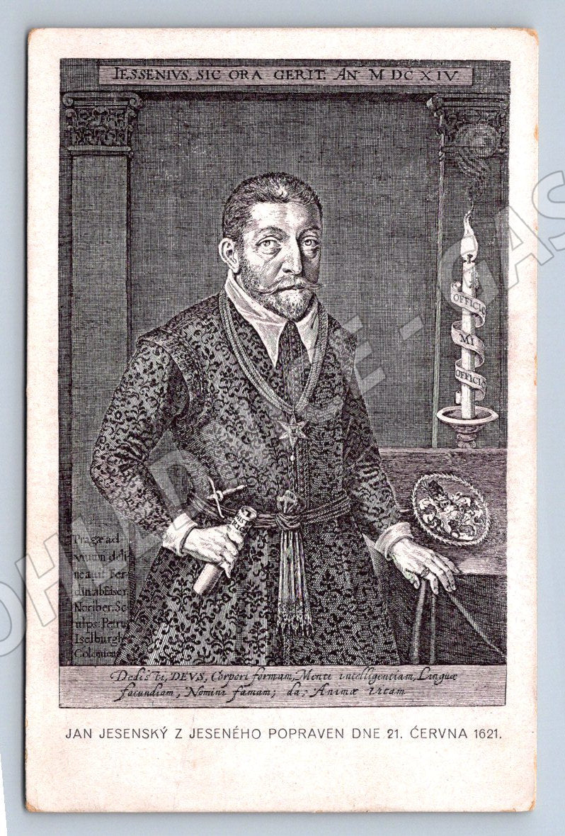 An older commemorative postcard issued in 1921 for the 300th anniversary of the execution of the Czech lords on the Old Town Square in Prague. The postcard depicts Jan Jesenský of Jesení, a prominent physician and rector of Charles University, who was among those executed in June 1621. The image is black and white, graphically executed in a historicizing style. On the back is a text with biographical information and a reminder of his heroic death. Published by the magazine Čecha Řím in Prague-Karlín. A very interesting piece for collectors of postcards with historical themes or personalities of Czech history.