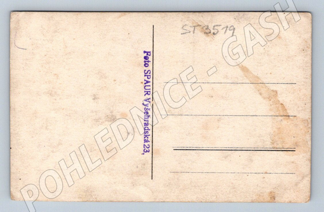 An old black and white postcard with a portrait of a young couple, probably a wedding or engagement photo. The image side depicts a woman in a traditional dress with a bouquet of flowers and a man in a dark suit with a bow tie. The background is a studio backdrop with softly blurred architecture. The reverse side is unwritten, with a typical address compartment, and marked with the stamp Foto SPAUR Vyšehradská 23. The postcard shows signs of age - the corners are slightly worn, traces of handling are visible, light stains and patina. An ideal addition to a collection of historical postcards of Czech origin.