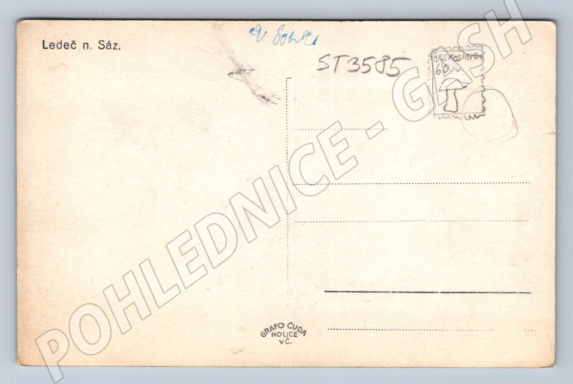 Original black and white postcard with a panoramic view of the town of Ledeč nad Sázavou, with the local castle and church tower in the center of the image. The postcard is from the first half of the 20th century and depicts the picturesque surroundings of the Highlands. On the back is the name of the town of Ledeč n. Sáz. and a pre-printed field for a stamp. Published by GRAFO ČUDA, Holice v Čechách. Very nice collector's condition, suitable for collectors of historical postcards, regional themes and lovers of Czech castles and chateaux.