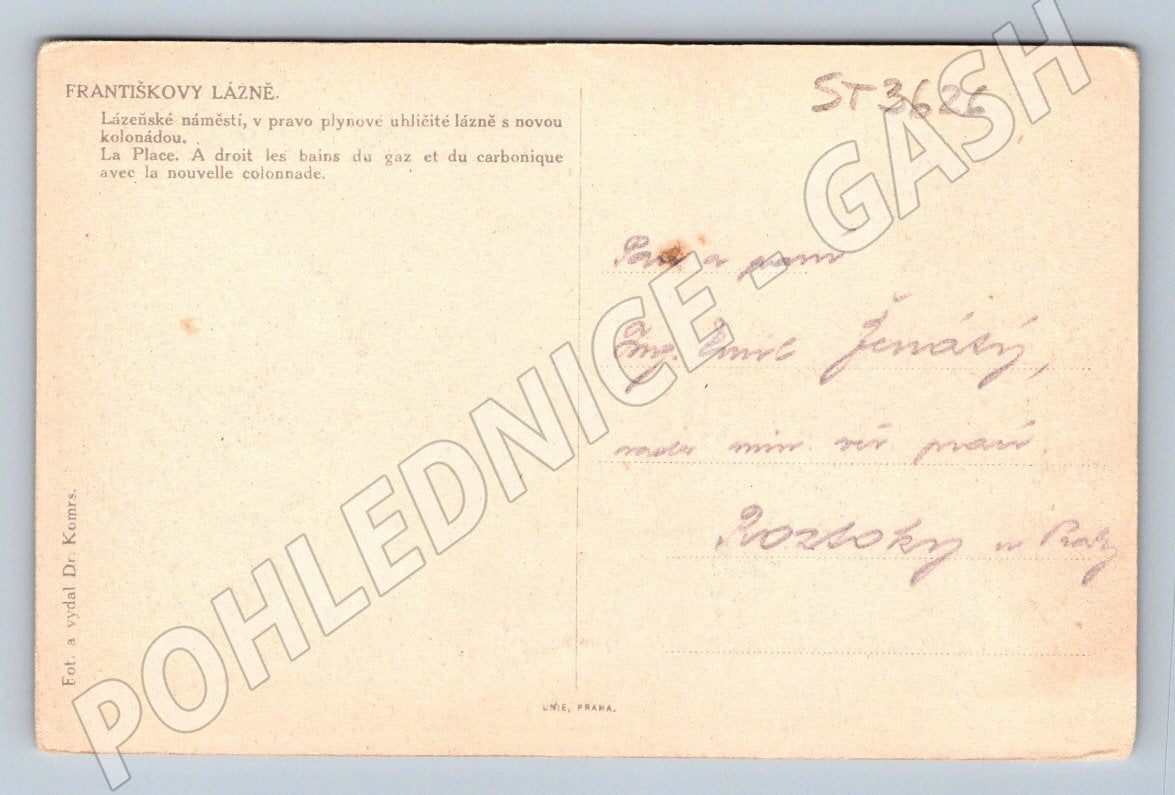 Original historical postcard Františkovy Lázně – Spa Square. The picture shows a beautiful view of the spa square with the dominant building of the gas carbonic baths and the new colonnade. The postcard dates from the first half of the 20th century, it is a small format. On the back you will find a description of the place in Czech and French, the publisher is Dr. Korns. The postcard is already written. An ideal collector's item for lovers of Czech spa towns and historical postcards.