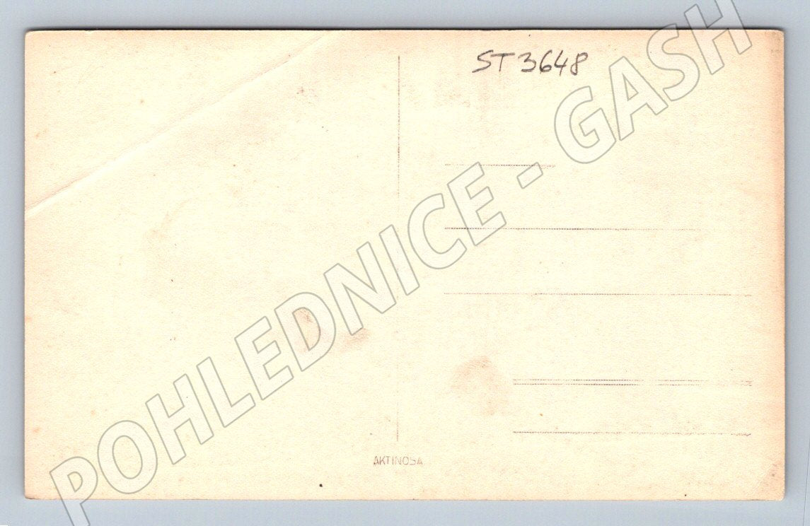 Original historical postcard showing Loket Castle from a bird's eye view. The postcard features a black and white aerial photograph capturing a picturesque panorama of the town with the castle dominating the landscape. On the back is a small inscription AKTINOSA and the number ST3648. The condition of the postcard is consistent with its age, with minor bends and signs of use visible on the front, and the corner may be slightly worn. The postcard has not been used (not sent). A great collector's item for lovers of historical monuments and Czech castles.