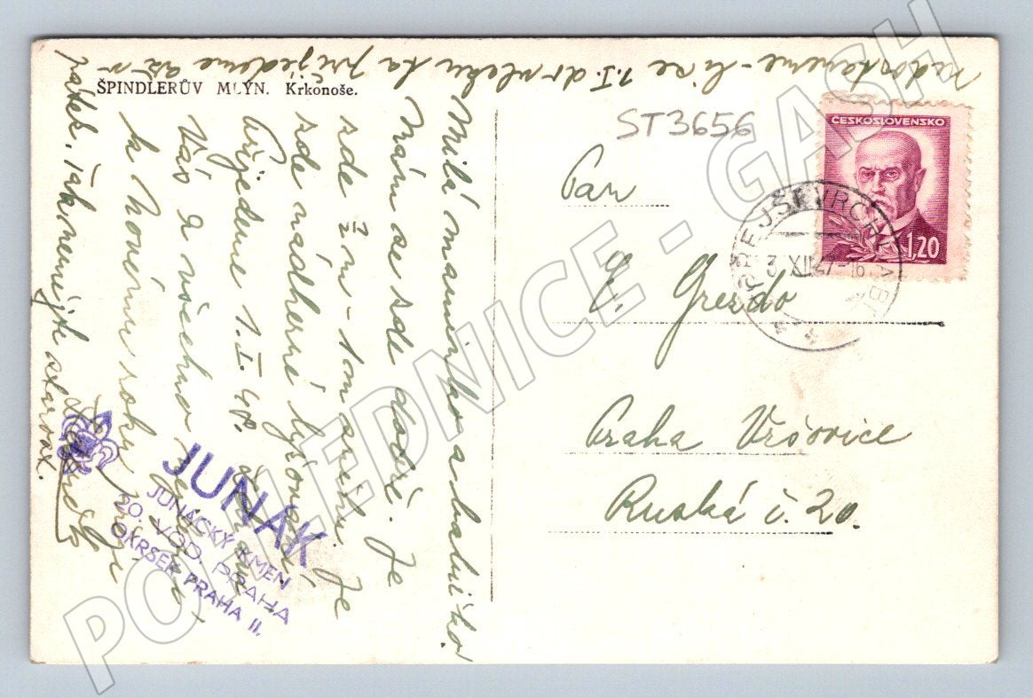 Original black and white postcard of the town of Špindlerův Mlýn in the Krkonoše Mountains. On the front side there is a winter view of the mountain town with typical architecture, snowy landscape and panorama of the Krkonoše forests and peaks in the background. On the back side there is preserved handwritten writing, a Czechoslovakia 1.20 CZK stamp and a postmark from the first half of the 20th century. The postcard is in a preserved collector's condition, suitable for history lovers, postcard collectors and those interested in regional themes of the Krkonoše Mountains and Špindlerův Mlýn. An attractive collector's item with a period atmosphere.