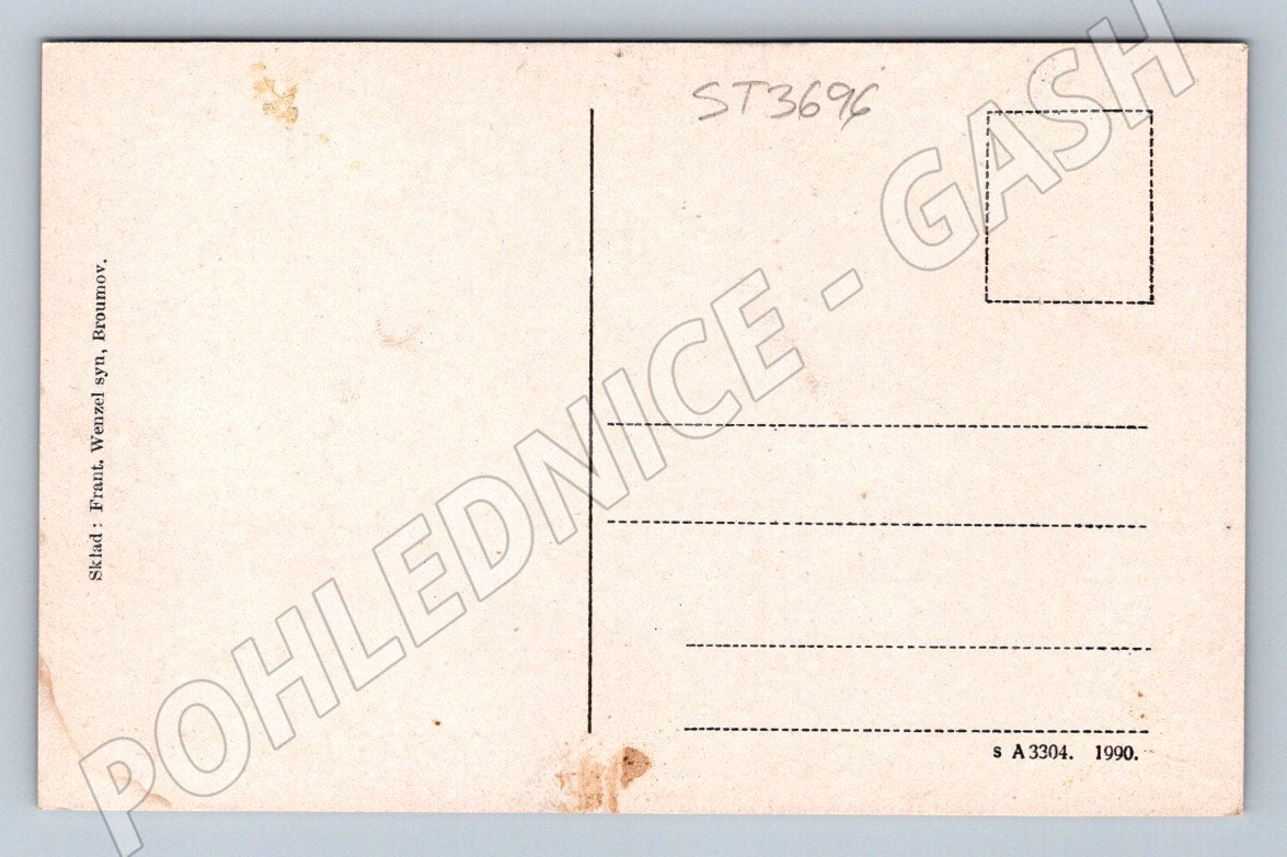 Original old postcard depicting the Adršpach Rocks – Lovers. The postcard dates from the period up to 1950 and has a classic small format. On the front side there is a colored drawing of famous rock formations, on the back it bears the publisher's name Frant. Wenzel syn, Broumov and the number A 3304. The postcard is in very good collector's condition, without description or stamp, suitable for a collection or as a decorative accessory. A rare piece from the Adršpach area, ideal for collectors of historical postcards with the motif of Czech natural beauties.