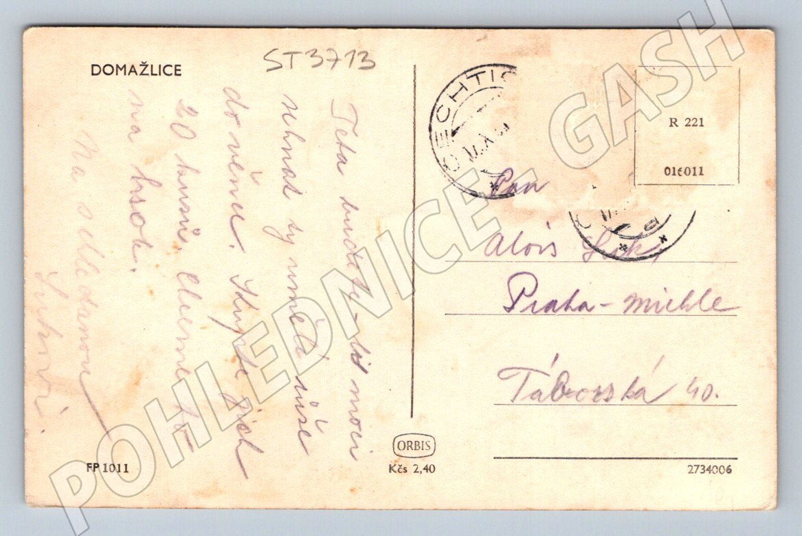Original historical postcard from Domažlice, depicting the typical architecture of the town with a dominant tower and facades of houses on the square. The postcard is printed in black and white and captures the atmosphere of the first half of the 20th century. On the back there is a handwritten dedication and addressee including postmarks. Excellent collector's condition with light patina corresponding to age. Suitable for a collection of postcards with Czech towns and regional history.
