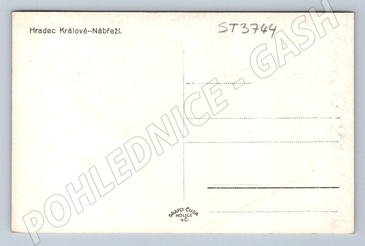 Original black and white postcard with a motif of the waterfront in Hradec Králové. The postcard beautifully captures the view of the historic city center across the river, including the church towers and the bridge. This is a small postcard format, unposted. On the back is the inscription Hradec Králové--Nábřeží . The postcard is in nice collector's condition without significant damage, suitable for a collection of historical views of cities from the first half of the 20th century.