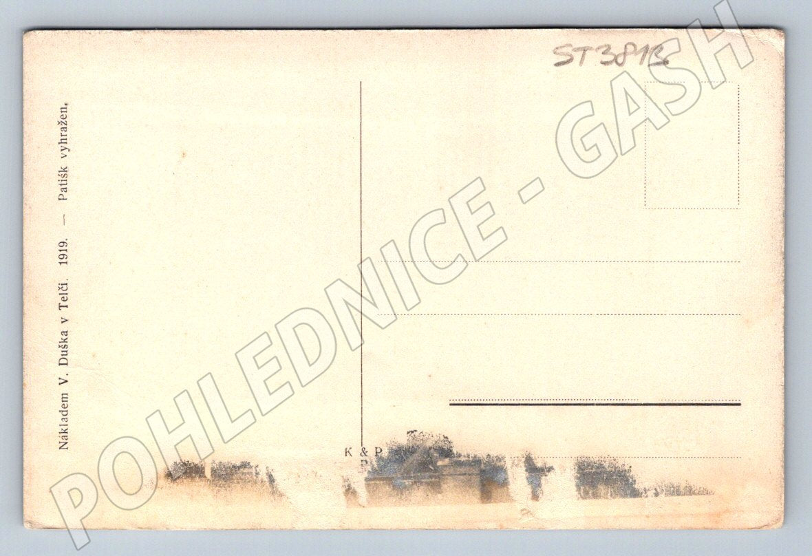 Original historical postcard of the city of Telč from 1919. The postcard is colored and depicts four different views of the center of Telč, including the iconic church towers, the square and the pond. On the back is printed Nakladem V. Dušek in Telč, 1919. The postcard has not been used, the condition corresponds to its age - slight wear on the corners, minor signs of age (see photo). An excellent collector's item from the period of the First Republic! Size small format.