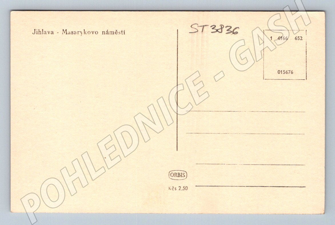 Original black and white postcard depicting Masaryk Square in Jihlava. The postcard shows busy life in the city center, historical buildings, a fountain and transport including period buses and cars. On the back is printed Jihlava - Masaryk Square, publisher Orbis. The postcard has not been mailed, it is in very good collector's condition with no signs of significant damage. This is an authentic document of period architecture and city life, suitable for a collection or as a decoration.