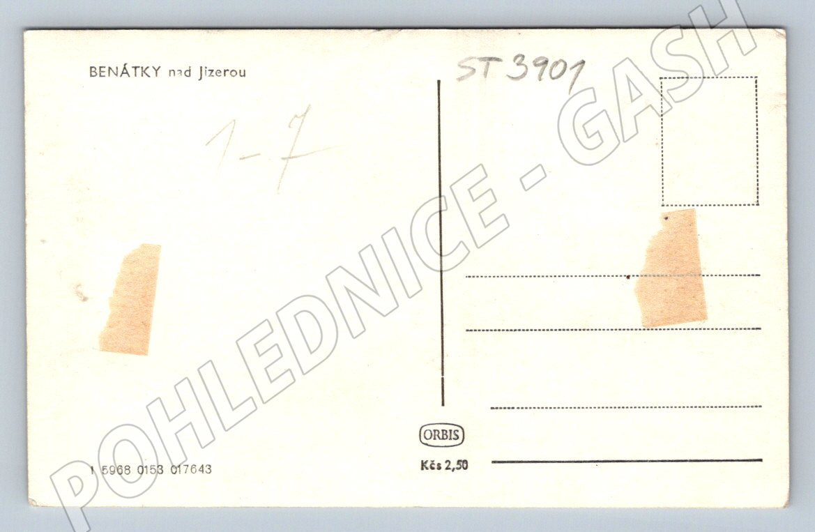 Original black and white postcard with a motif of a historical building in Benátky nad Jizerou. The front side depicts a church or an architecturally significant building with a tower, surrounded by greenery. The postcard has a classic layout with a back side for the address and stamp, without a stamp or postmark, only remnants of glue. Very good condition, small signs of age corresponding to the time of creation. Publisher: Orbis, printed price: CZK 2.50. An interesting piece for a collection of regional postcards, suitable for collectors of Czech cities or architecture lovers.