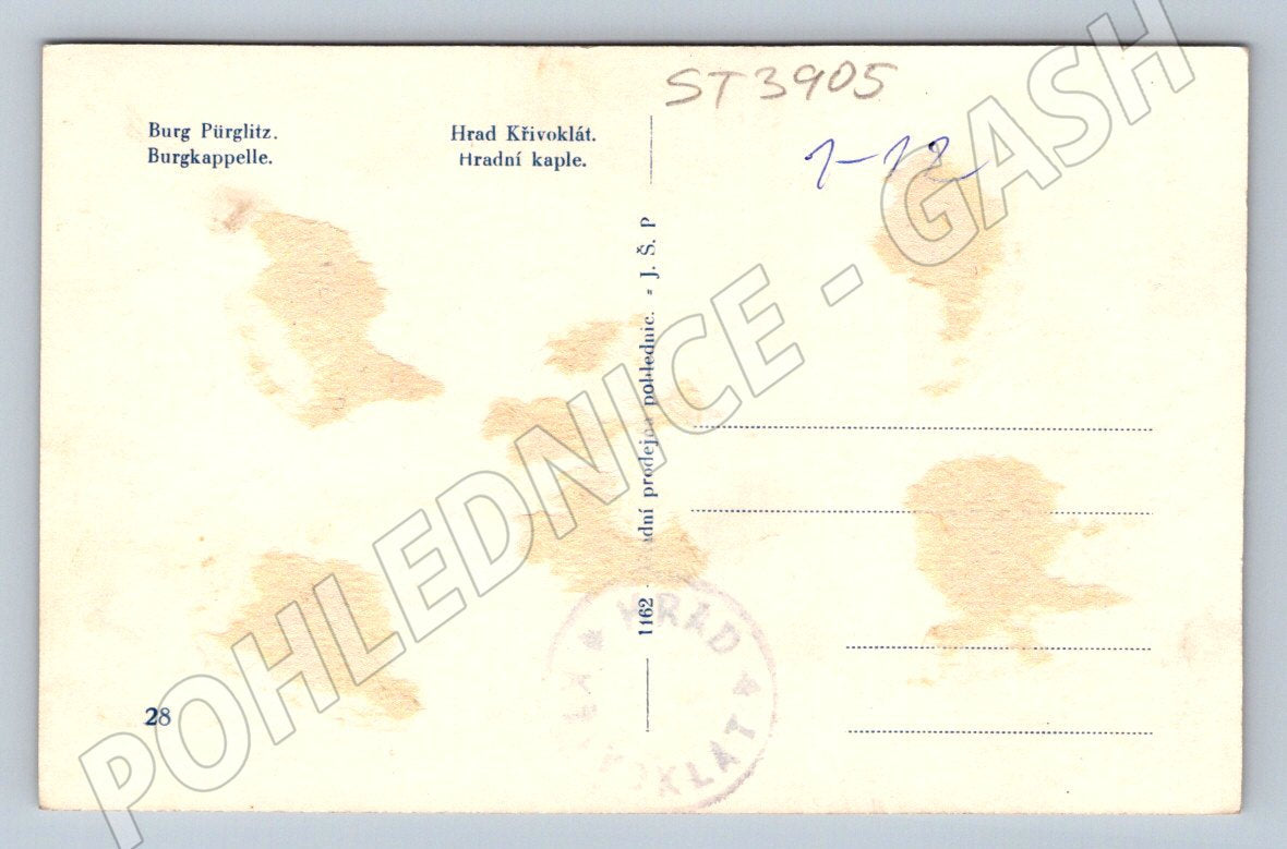 I am offering an original historical postcard depicting the interior of the castle chapel at Křivoklát Castle (Burg Pürglitz, Burgkapelle). It is a black and white postcard with text in German and Czech on the back. The postcard is in collector's condition, showing signs of age and wear in the form of stains and prints from previous mounting. It perfectly captures the architectural details of the vault and altar of this important monument. Suitable for collectors of historical postcards, architecture lovers and those interested in Czech castles and chateaux.