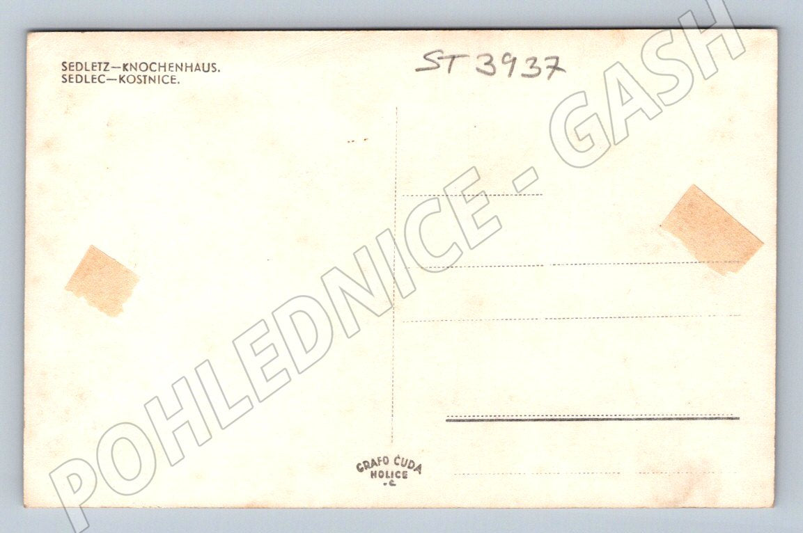 Original black and white postcard depicting the famous ossuary in Sedlec near Kutná Hora. On the front side there is a detailed view of the decoration of the chapel, which is made of human bones and skulls. This is a unique monument and a very popular tourist destination, known for its specific atmosphere and history. The postcard was published by the Grafo Čuda Holice publishing house. On the back side there is a printed description of the place in Czech and German (Sedlec – ossuary, Sedletz – Knochenhaus) and space for an address and a stamp. The postcard is historical, suitable for a collection or as a rare collector's item.