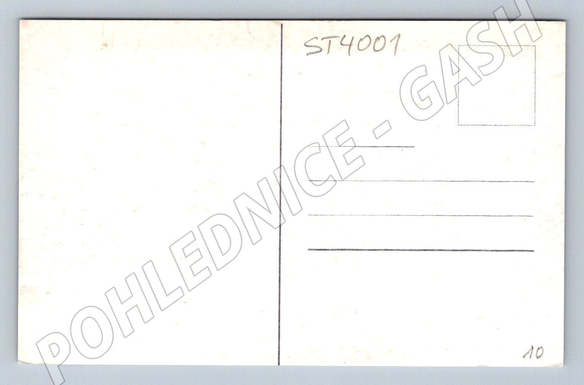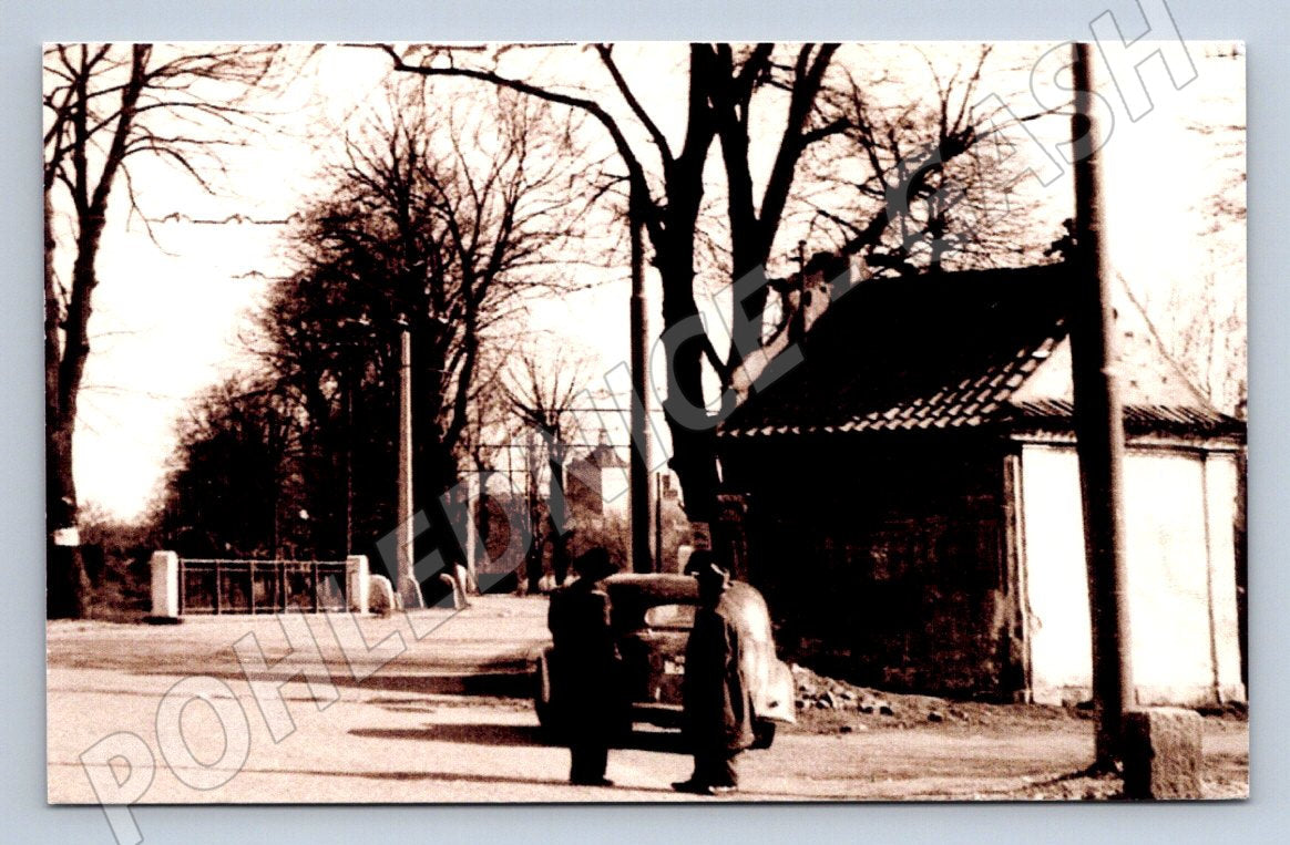 I am offering an original black and white postcard depicting a scene from the first half of the 20th century. The photograph shows a car with a driver standing near a road in an alley lined with trees, near a small building with a typical sloping roof. The scene evokes the interwar period and the authentic atmosphere of road transport at that time. The postcard is unposted, clean, in very good condition, with only minor signs of age. The postcard format corresponds to classic dimensions. An ideal addition to the collection of lovers of historical transport or period postcards.