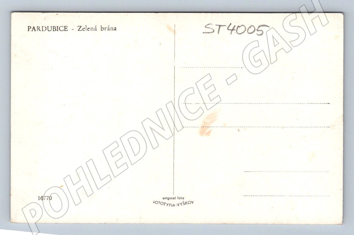 Original old black and white postcard with the motif of the Green Gate in Pardubice, a significant historical monument and landmark of the city center. The postcard depicts the facade of the gate with a clock and the surrounding architecture of the square. The back is unworn, clean, printed text "PARDUBICE - Green Gate", publisher FOTOTYPIA Vyškov, number 16770. The postcard is in very good collector's condition, only a small trace of handling. An excellent addition to any collection of historical postcards with the theme of Czech cities.