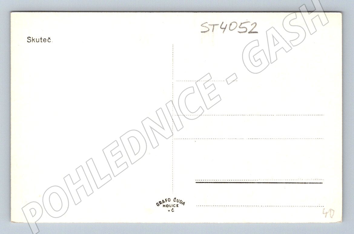 Original black and white postcard of the town of Skuteč. The postcard depicts an overall view of the town with the church as its dominant feature and the surrounding landscape, typical of the Czech countryside. The back side shows the name Skuteč and the manufacturer GRAFO ČUDA, HOLICE v Č. . The postcard is in very good condition, without description and without a stamp. Suitable for collectors of old postcards, lovers of regional history or as a gift.