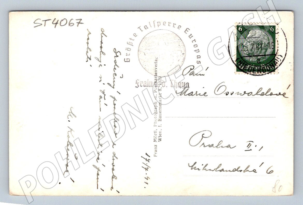 Original historical postcard with the motif of Frain an der Thaya (Vranov nad Dyjí), depicting a view of Vranov Castle and the adjacent town in the Dyje valley. The postcard shows a period car and a bridge over the river. It is a black and white photograph with a distinct atmosphere of the 1st half of the 20th century. On the back there is a stamp and a postmark (war period, Austria), handwritten text and address. The postcard is in very good condition with minor signs of age, suitable for a collection or for lovers of regional history.