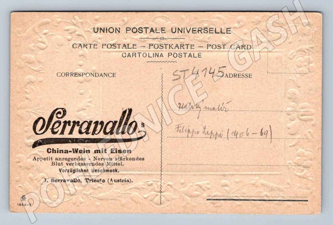 Beautiful antique postcard with a motif from the work of the Italian Renaissance painter Filippo Lippi - depicting the figure of a monk and a nun in an interior, probably a scene from monastic life. The postcard is decorated with a richly embossed frame with colorful flowers, which contributes to its unique decorative appearance. On the back you will find the inscription Serravallo and an advertising message in German, this is a type of collector's postcard with an artistic theme. The condition corresponds to its age, the postcard is unposted and in good collector's condition. An exceptional piece for lovers of historical philocards and art.