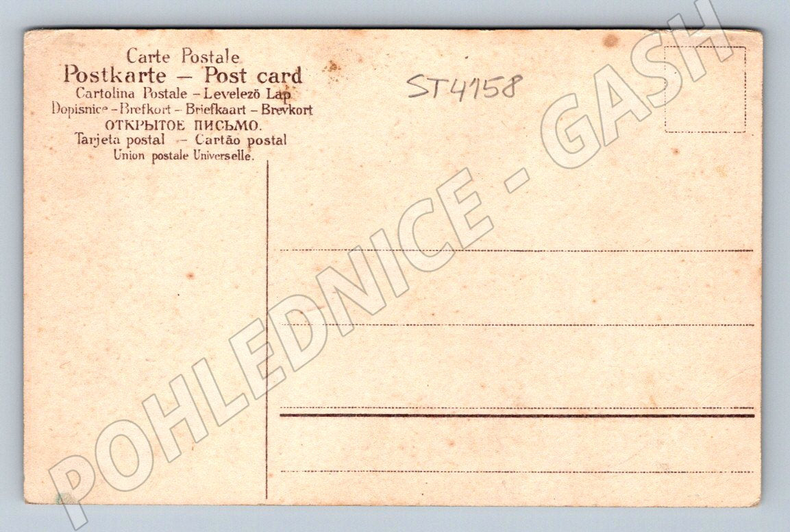 Older postcard with a water transport motif. The colorful illustration depicts a small boat on a calm river lined with lush greenery and trees, on the shore there is a wooden pier with two figures. The back of the postcard is clean, only with inscriptions in various languages and a place for a stamp. The postcard is in very nice collector's condition, without any signs of posting or description. Suitable for lovers of old postcards with a transport theme or collectors of water transport.
