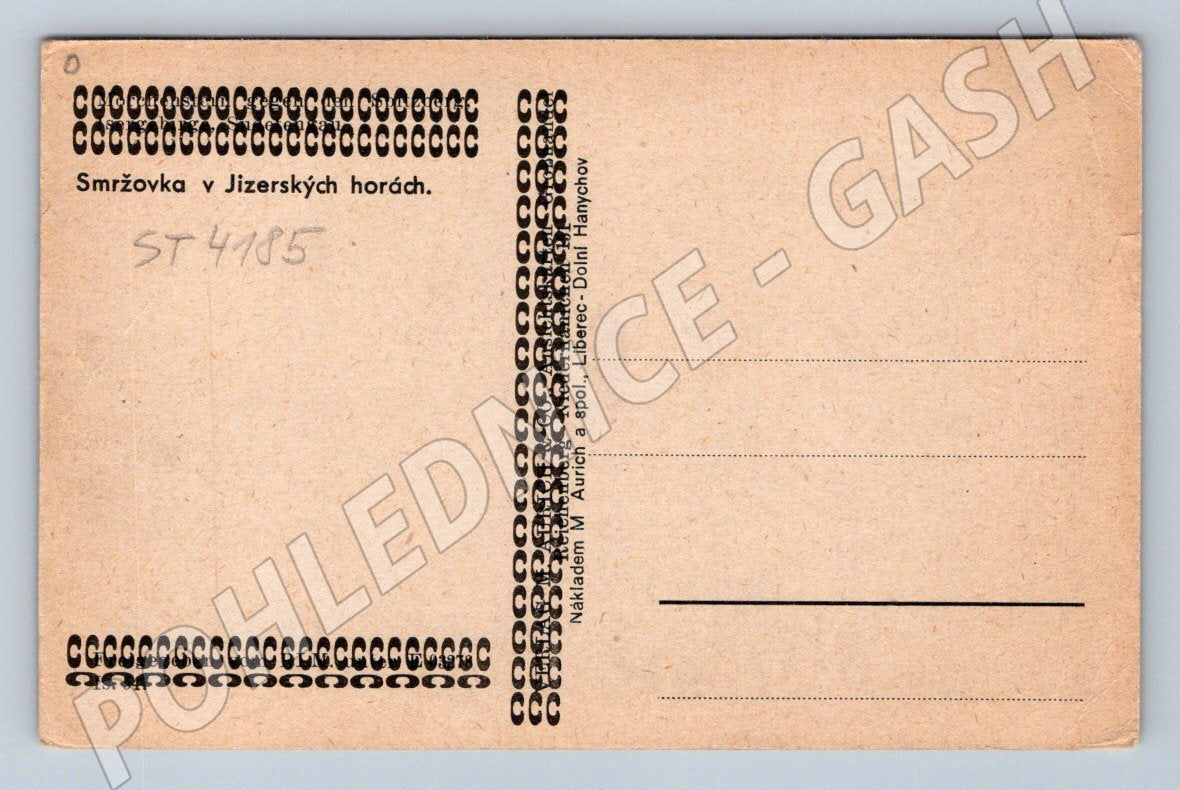 Original black and white postcard depicting the picturesque town of Smržovka in the Jizera Mountains. The postcard depicts a panorama of the town along with the surrounding hills and forests. On the reverse side is the text Smržovka in the Jizera Mountains and printed decorative borders. The postcard dates from the first half of the 20th century, in good collector's condition with minor signs of age. Suitable for a collection of regional postcards or as historical documentation of the Czech mountains, architecture and landscape. Classic small format size.
