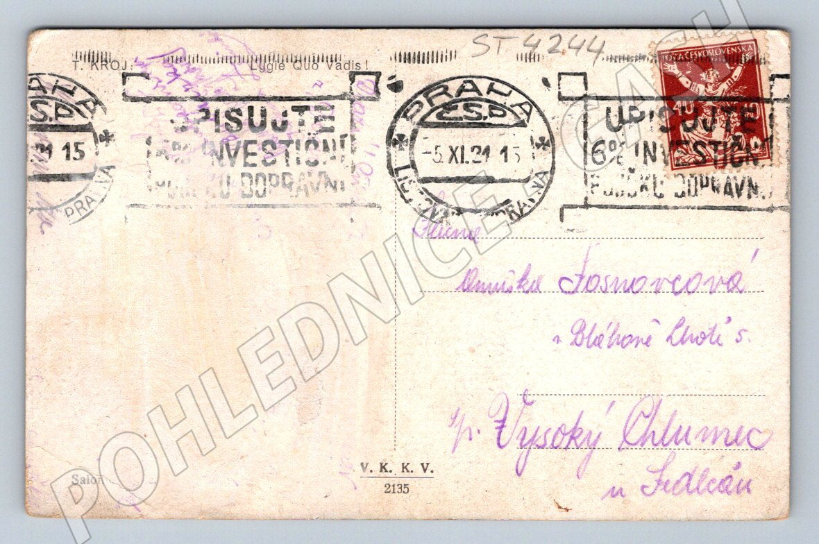 I am offering an original old postcard with a painting motif, used and bearing a period stamp and postmark from 1915. On the front side of the postcard there is a romantic scene of a man and a woman in a garden, surrounded by flowering bushes, which indicates the Art Nouveau style and subtle color design. The postcard was sent and is described with handwritten text. On the back you will find a Czechoslovak postage stamp with clear impressions of postmarks from Prague. The postcard bears slight signs of wear corresponding to its age. An ideal accessory for collectors of historical postcards or those interested in Art Nouveau painting and old graphics.