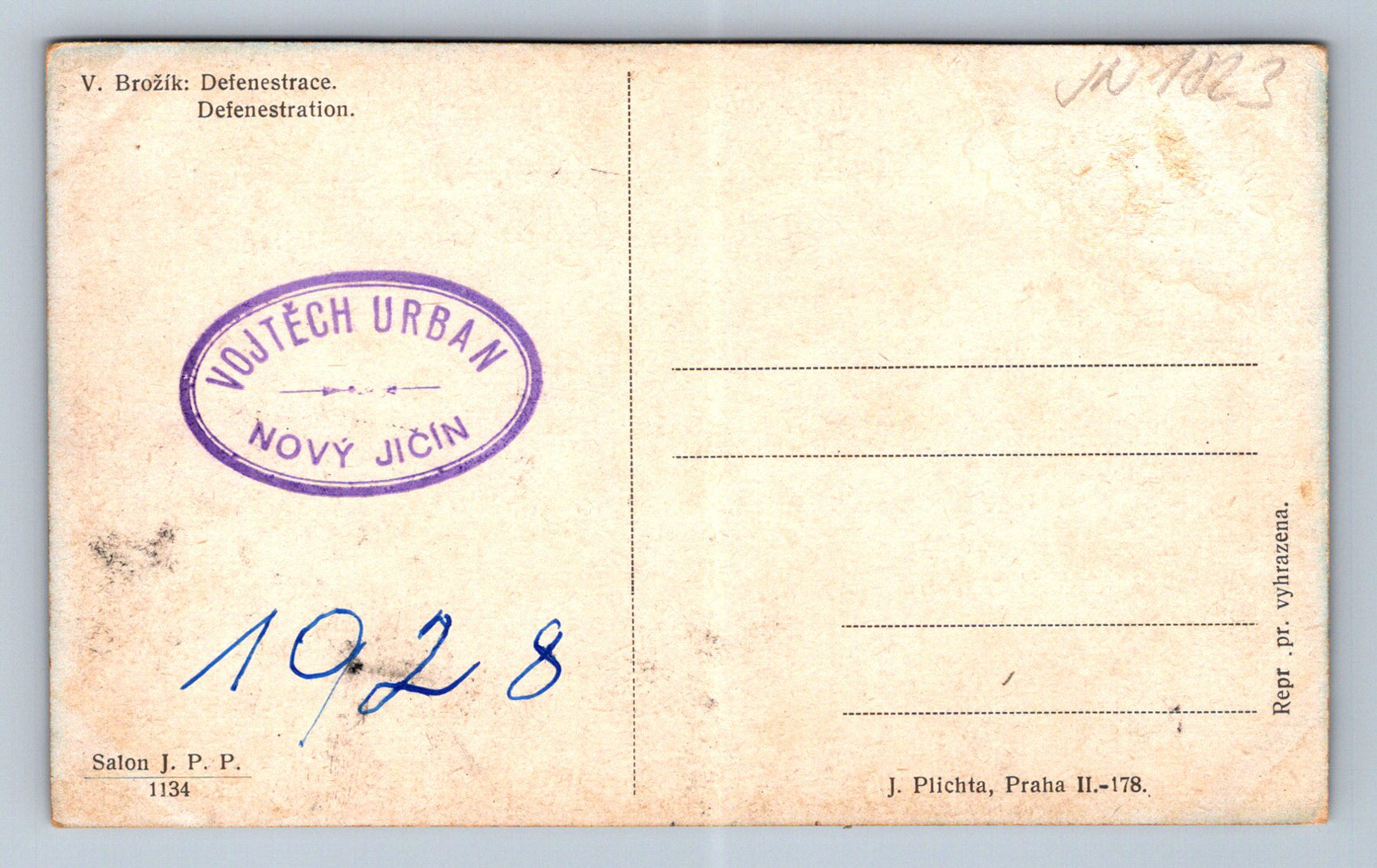 Pohlednice V. Brožík: Defenestrace. Fialové razítko Vojtěch Urban (JN1