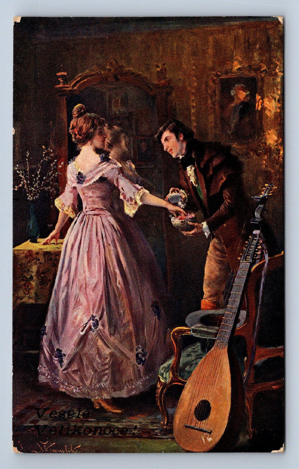 Pohlednice Veselé Velikonoce! Kramlík Dáma v růžových šatech (JN1863)
